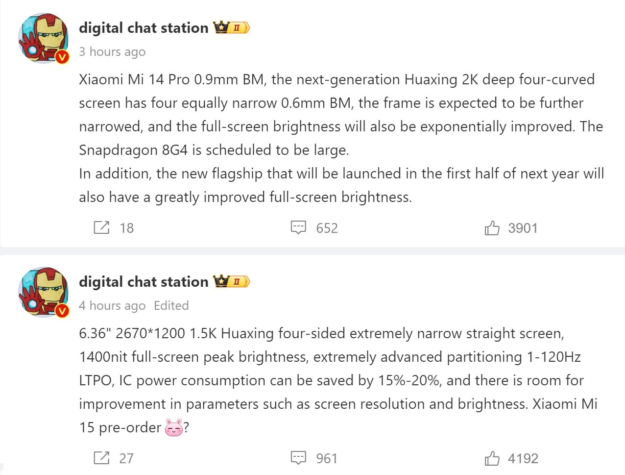 Und er lieferte gleich noch die allerersten Infos zu den Plänen, die Xiaomi aktuell für die Xiaomi 15 Generation wälzt. Demnach soll beim Nachfolger des Xiaomi 14 Pro der Displayrand auf sensationelle 0,6 mm schrumpfen und das sogar symmetrisch an allen vier Seiten - dank der nächsten Generation eines QHD-Displays von TCL CSOT. Das mit dem Super-Chip Snapdragon 8 Gen 4 bestückte Xiaomi 15 Pro soll zudem natürlich Helligkeitsrekorde schlagen. Sehr konkret auch bereits die Hinweise auf das reguläre Xiaomi 15: Das wird offenbar ein flaches, dynamisches 6,36 Zoll LTPO-AMOLED mit 2.670 x 1.200 Pixeln und ebenfalls sehr dünnen Rändern bieten, das 1.400 nits Full-Screen-Brightness mit 15 bis 20 Prozent Energie-Einsparungen kombiniert.