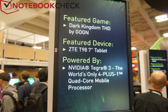 Das ZTE 7-Zoll-Tabet T98 integriert den 4-Plus-1 Quad-Core-SoC Tegra 3 von Nvidia und auf der GDC 2012 können wir uns einen Eindruck davon machen, wie das ZTE-Tablet mit Dark Kingdom THD läuft. Dark Kingdom THD ist eines der Spiele, die speziell für den Nvidia Tegra 3 optimiert sind. Das Game besticht mit einer - für Tablets - sehr anspruchsvollen Grafik mit realistischen Normal Maps und tollen Wassereffekten.