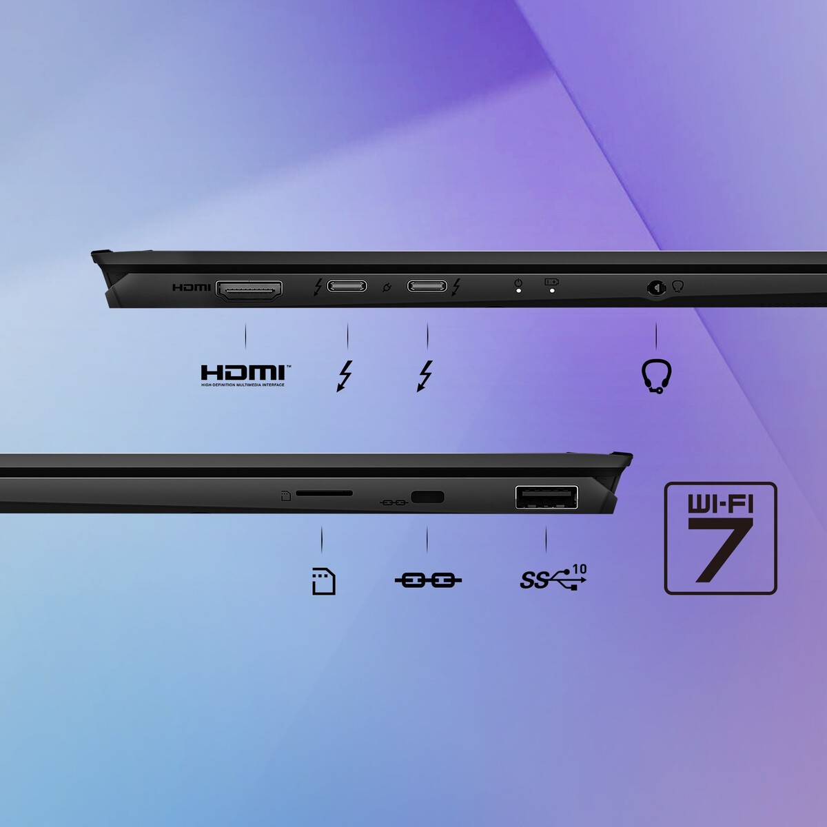 Das Ultrabook besitzt ein 13,3 Zoll großes OLED-Panel im 16:10-Format, das eine Auflösung von 2.880 x 1.800 Pixel erzielt. Das Panel kann den DCI-P3-Farbraum vollständig darstellen, die VESA DisplayHDR True Black 500 Zertifizierung garantiert eine HDR-Spitzenhelligkeit von zumindest 500 Nits. Das Notebook bietet zwei USB-C-Anschlüsse, die beide Thunderbolt 4 unterstützen, einmal USB-A, einmal HDMI und einen microSD-Kartenleser.