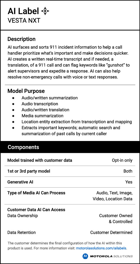 Die Labels enthalten Informationen über die Art der eingesetzten KI-Modelle, die Datenverarbeitung, menschliche Kontrollmöglichkeiten sowie die konkrete Funktion im Anwendungskontext. Motorola positioniert die Maßnahme als Antwort auf die zunehmende Komplexität von KI-gestützten Systemen in sicherheitskritischen Bereichen, in denen schnelle, fundierte Entscheidungen gefordert sind.