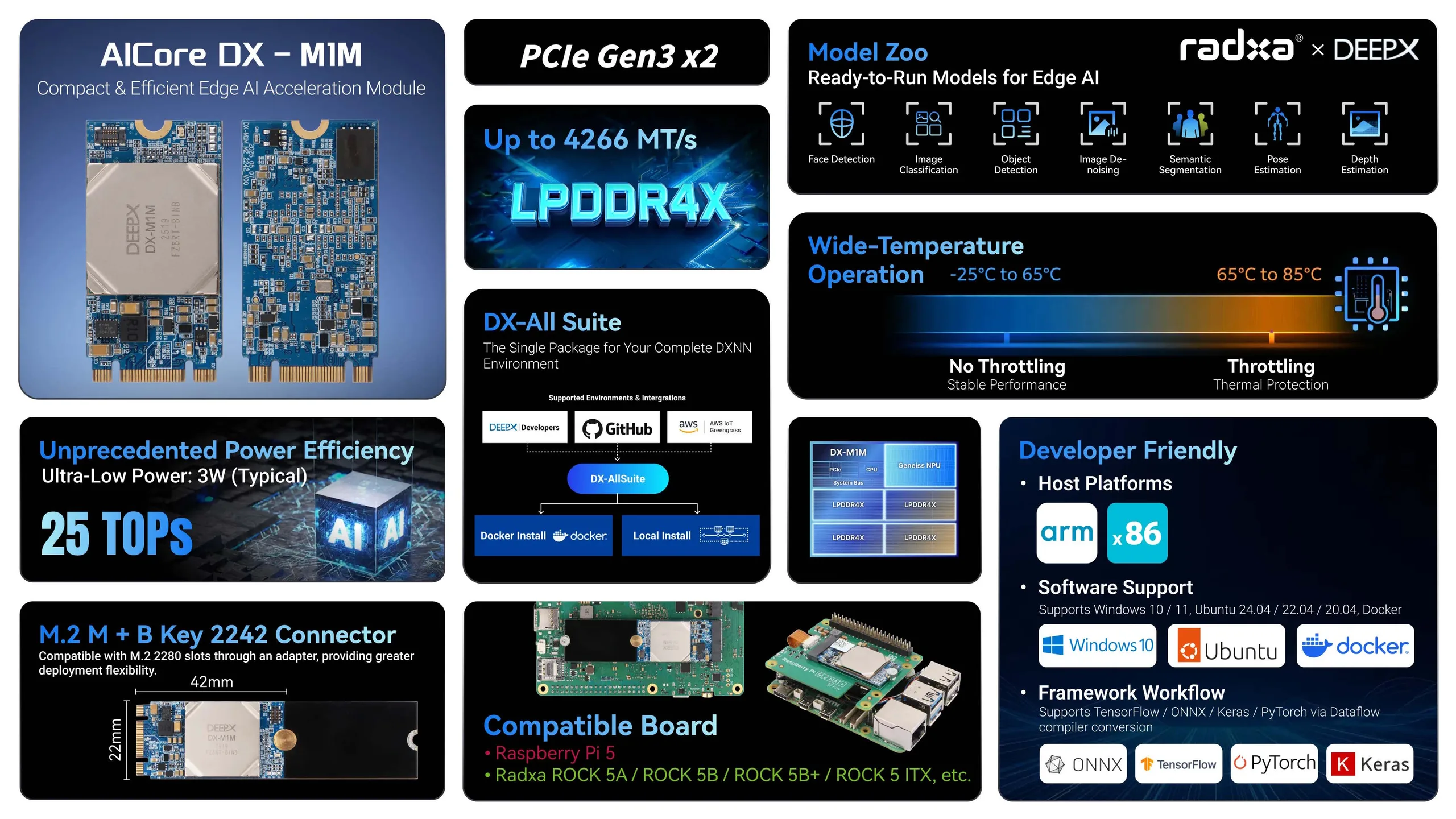 Radxa hat mit der AICore DX-M1M eine neue Beschleunigerkarte im kompakten M.2-Format im Angebot. Konkret handelt es sich um eine M.2 2242-Karte, welche dementsprechend 42 Millimeter lang und 22 Millimeter breit ist. Die Anbindung erfolgt über zwei PCIe 3.0-Lanes, wobei wenig überraschend die Abwärtskompatibilität gegeben ist. Als eigentlicher SoC wird der namensgebende DeepX DX-M1M genutzt. Direkt verbaut ist ein LPDDR4X-Arbeitsspeicher mit einer Kapazität von einem Gigabyte. Die KI-Rechenleistung wird auf 25 TOPS beziffert. Um unbedingt ein vollständiges, lokales LLM auf dem AICore DX-M1M laufen zu lassen, dürfte die Leistung am Ende des Tages gleichwohl nicht unbedingt ausreichen, allerdings könnten sich beispielsweise Bilder auswerten lassen. So wäre eine Klassifizierung ebenso denkbar wie die Erkennung von Objekten oder auch Gesichtern.