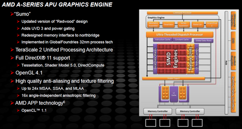 Ein Hauptaugenmerk bei der Entwicklung von Llano lag auf der Integration einer leistungsfähigen GPU. Die Grafikeinheit mit Codenamen "Sumo" basiert auf dem DirectX-11-fähigen Redwood-Kern, der unter anderem auf der Radeon HD 5600 Serie verbaut wurde. In den Modellen der A8-Reihe (Radeon HD 6620G) sorgen 80 VLIW5 Einheiten mit zusammen 400 Shader-ALUs bei 444 MHz Takt für eine Leistung, die sich etwas hinter Modellen der unteren Mittelklasse wie einer Radeon HD 6530M oder der Geforce GT 525M einordnet. Dies genügt, um aktuelle Spiele in mittleren Auflösungen und Qualitätseinstellungen flüssig darzustellen. In den Modellen der Reihen E2, A4 und A6 sind nur 160, 240 bzw. 320 Shader-ALUs aktiviert, was die Performance entsprechend schmälert. Für die Videodecodierung ist der aktuelle UVD3 (Universal Video Decoder) verantwortlich.