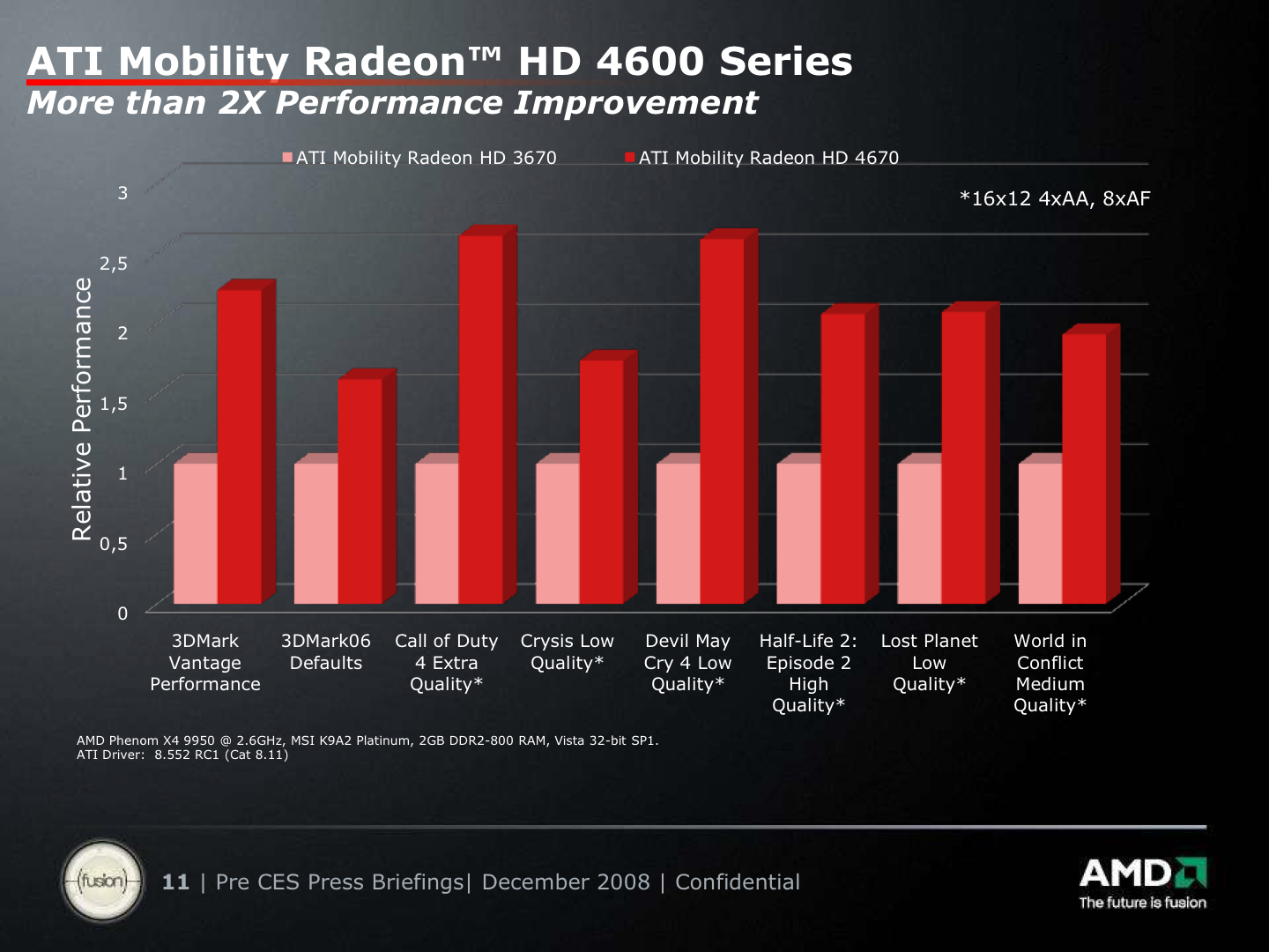Zum Launch veröffentlichte AMD nur relative Benchmarks der HD 4670 zur alten Mobility HD 3670. Ausserdem wurden die Ergebnisse mit einem Desktop Quad-Core Prozessor in unspielbaren Einstellungen (für eine Mittelklasse Grafikkarte) von 1600x1200, 4x Antialiasing und 8x Anisotrope Filterung. Dadurch ist die folgende Grafik nur von begrenztem Wert.