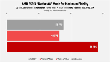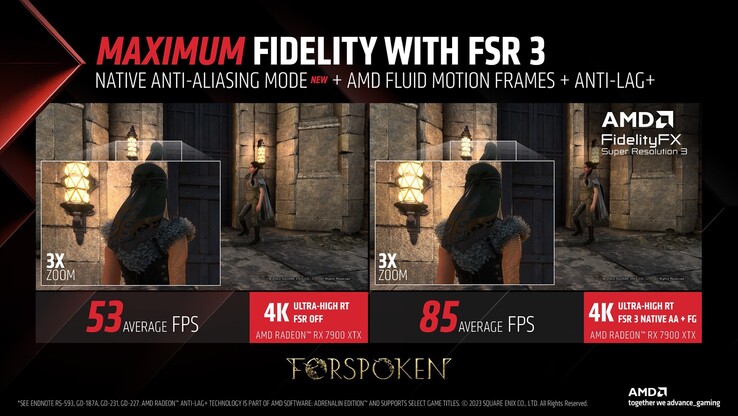 Die Benutzeroberfläche von Spielen soll von Frame Generation nicht verändert werden. FSR 3 unterstützt die bekannte Upscaling-Technologie von FSR 2, die mit Frame Generation kombiniert werden kann, um die Bildrate im Bestfall zu vervierfachen. In einem von AMDs Beispielen kann die Bildrate von Forspoken auf einer Radeon RX 7900 XTX (ca. 1.030 Euro auf Amazon) in 4K-Auflösung mit aktivem Raytracing von 53 fps auf 175 fps erhöht werden, wenn FSR im Performance-Modus mit Frame Generation zugeschaltet wird.