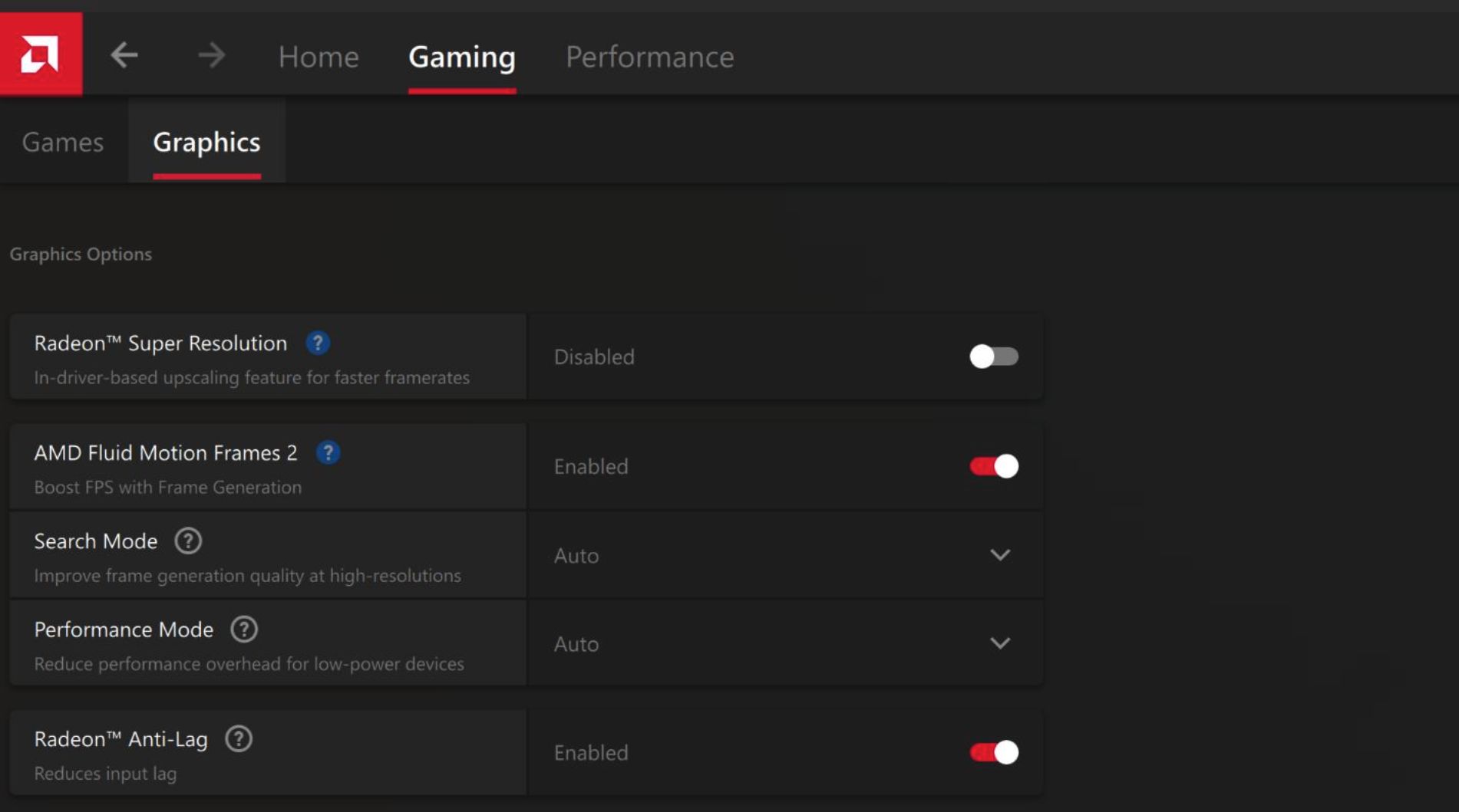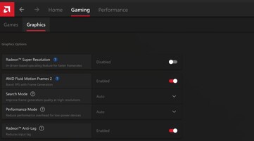 Nach der Installation des Preview-Treibers kann AFMF2 in der Adrenalin-Edition-Software über den Unterpunkt „Grafik“ des „Gaming“-Reiters in der Anwendung aktiviert werden. Da die Frame-Generierung immer mit einer gewissen Latenz einhergeht, wird dabei automatisch auch AMD Radeon Anti Lag aktiviert. Zusätzlich kann mit dem aktuellen Preview-Treiber auch „Variable Graphics Memory“ (VGM) für AMD Mobile Prozessoren der Ryzen AI 300 Serie aktiviert werden (unter „Performance“ -> „Tuning“).