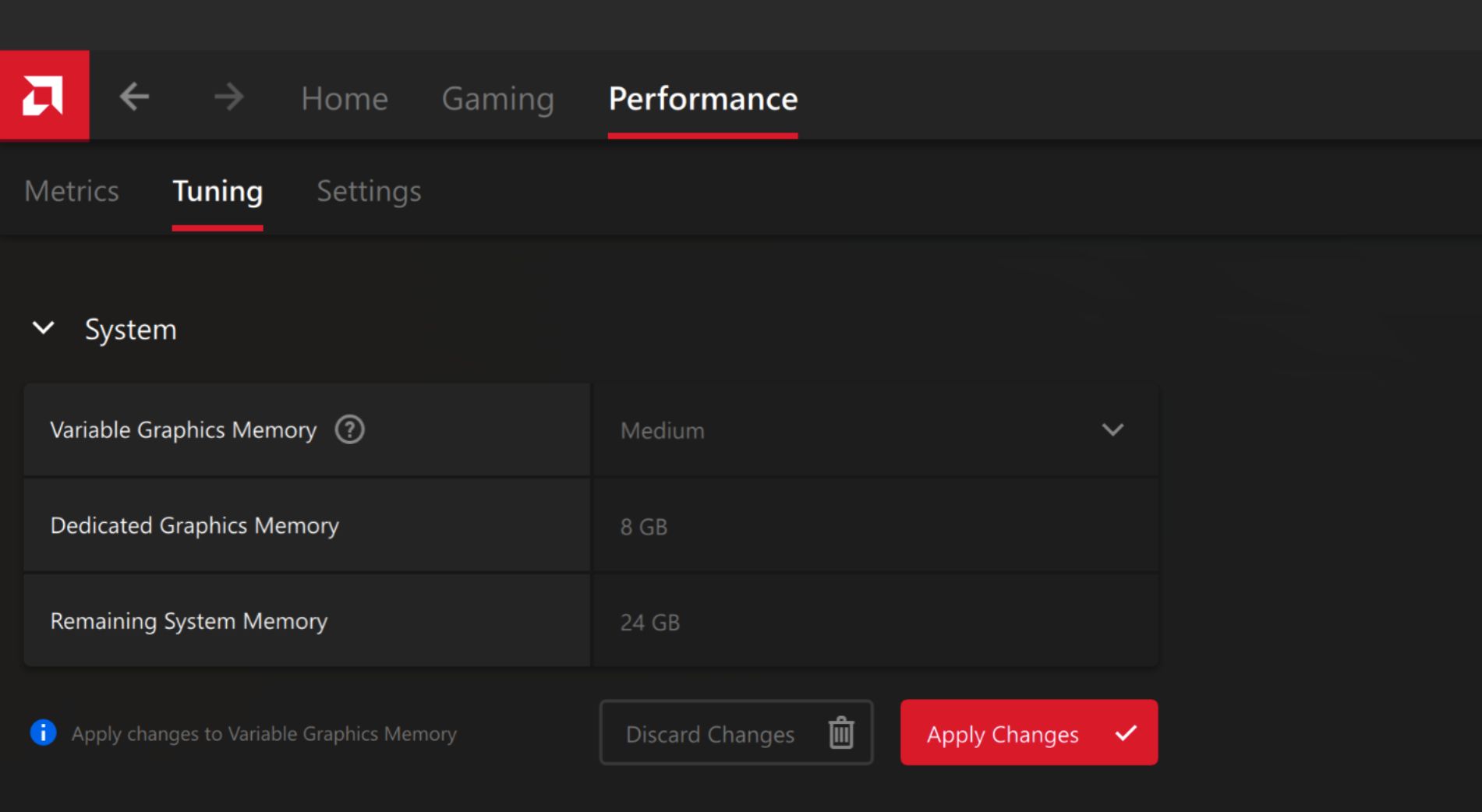 Mit dem neuen Feature „Variable Graphics Memory“ können bis zu 75 % des System-RAMs als Grafikspeicher zugewiesen werden. Während integrierte Grafikeinheiten normalerweise 512 MB zugewiesen bekommen, würde VGM in der Einstellung „Medium“ bei einem Notebook mit 32 GB RA beispielsweise GB Arbeitsspeicher als VRAM für eine Radeon 890M iGPU zuweisen. Dies erfordert jedoch einen Neustart des Laptops.
