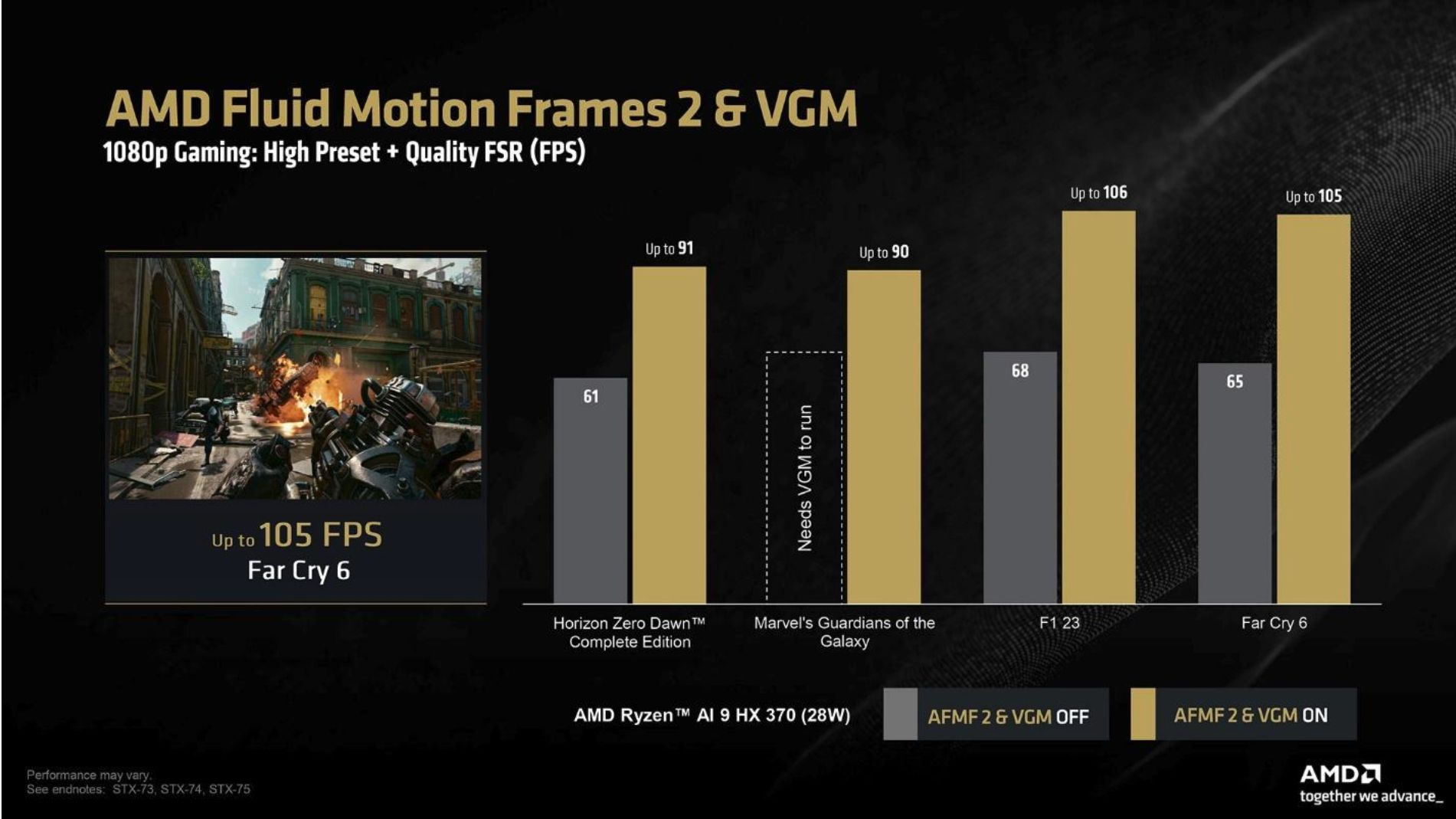 Um die Leistungssteigerung durch AFMF 2 und VGM auf Laptops mit Ryzen AI 300 Prozessoren zu demonstrieren, hat AMD eigene Benchmarks auf einem Asus Zenbook S 16 unter Windows 11 Pro 24H2 (Build 26100.1301) mit mehreren Spielen in einer Auflösung von 2.800 × 1.800 Pixeln durchgeführt. Der Laptop besitzt einen Ryzen AI 9 HX 370-Prozessor, ein 16 Zoll OLED-Display, 32 GB RAM und eine 1 TB SSD.
