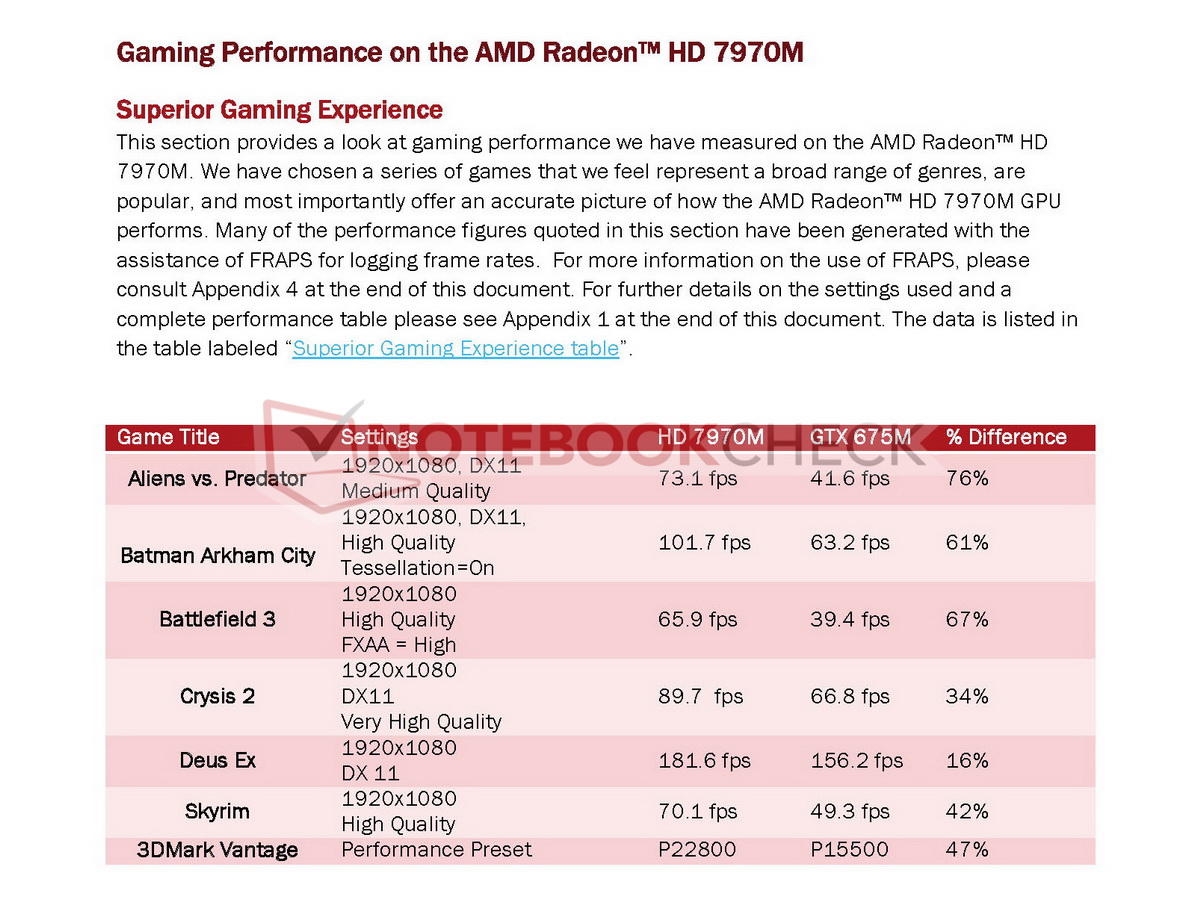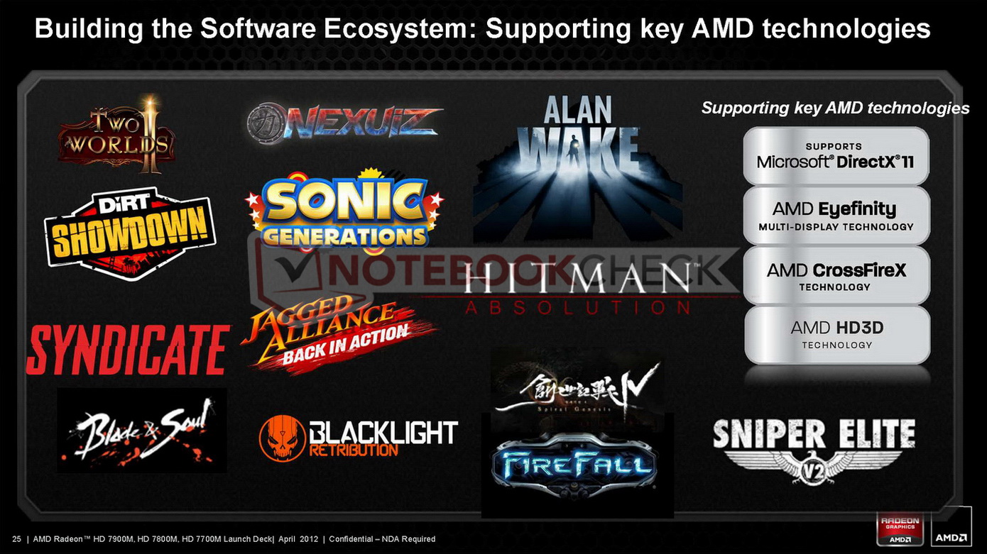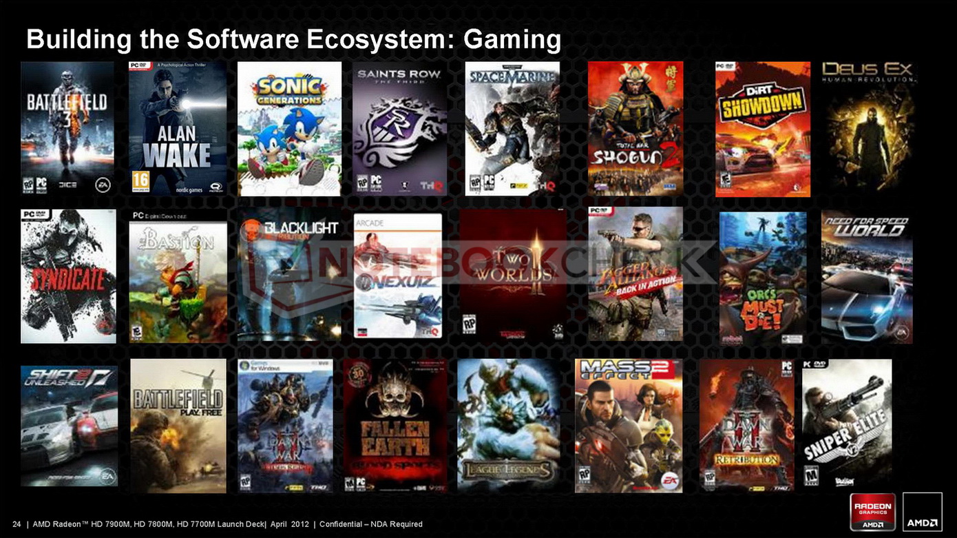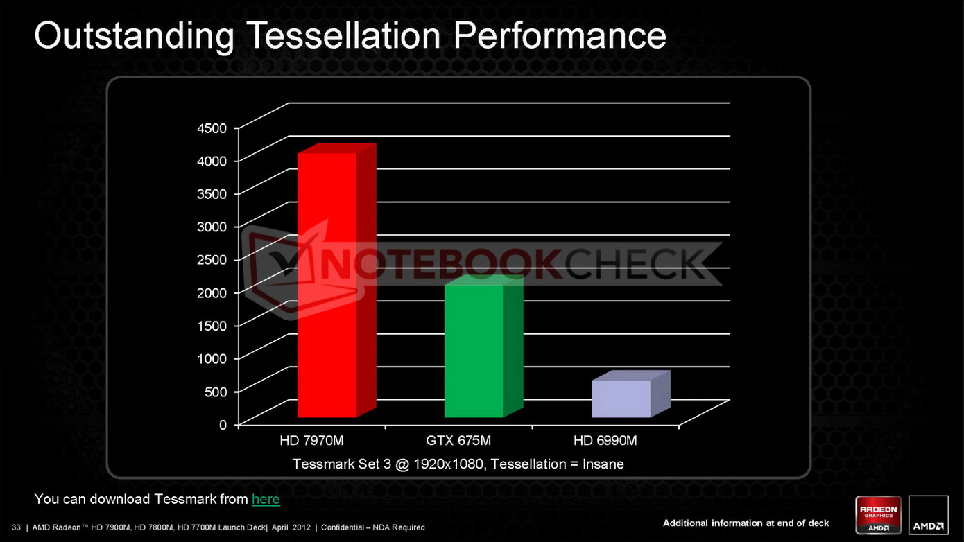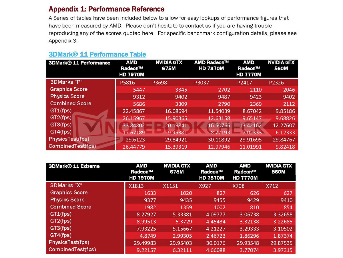 Aktuell hat AMD die SKUs Radeon HD 7770M, Radeon HD 7870M und Radeon HD 7970M angekündigt. Mit der Radeon HD 7770M adressiert AMD vor allem den Markt der Ultra-Thin-Notebooks. Damit sollen sich laut AMD zahlreiche aktuelle PC-Spiele wie Battlefield 3, Metro 2033 und Skyrim in HD-Qualität spielen lassen. Beim 3DMark 11 nennt AMD für die HD 7770M einen Wert von P2417. Für die stärkere Radeon HD 7870M hat AMD einen Wert von P3037 ermittelt. Die AMD Radeon HD 7970M soll mit P5816 eine Geforce GTX 675M von Nvidia (P3698) deutlich übertreffen.