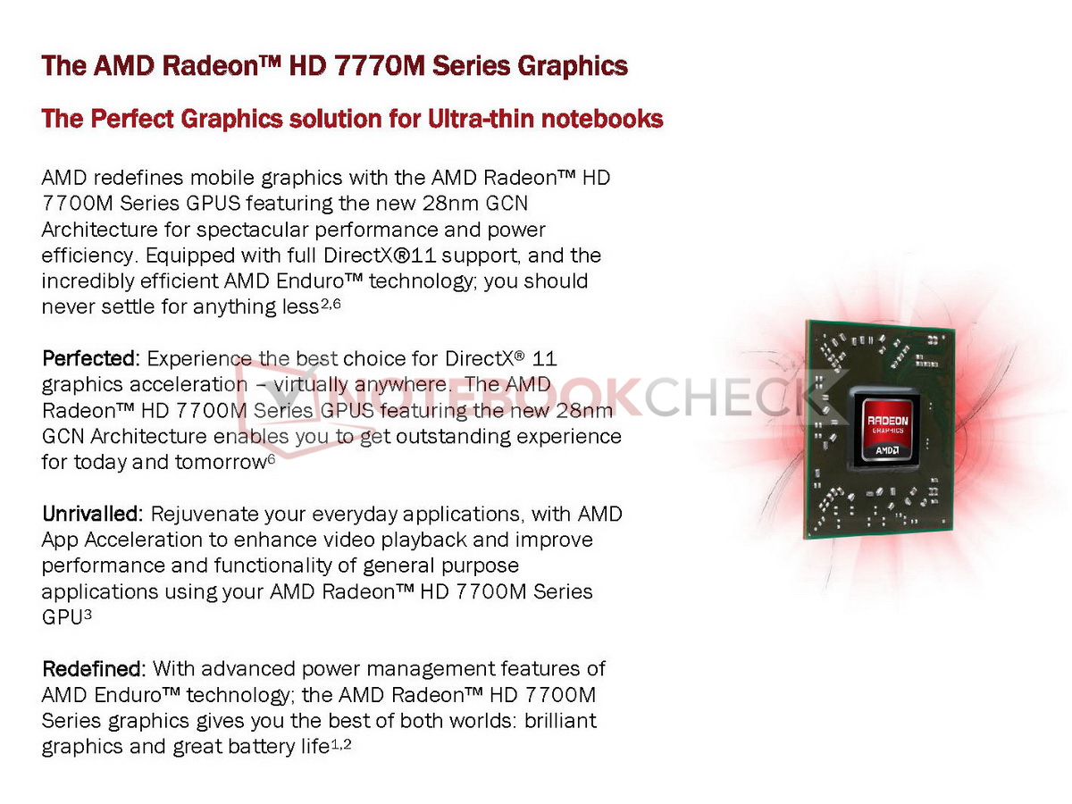 AMDs neueste Notebook-GPUs der Serien Radeon HD 7700M, HD 7800M und HD 7900M integrieren neben der GCN-Architektur auch AMDs "Enduro Technologie" für die automatische Umschaltung zwischen integrierter GPU und dedizierter AMD-Grafik sowie einer schnellen Video Codec Engine (VCE) für H.264. Zudem bietet die Serie Radeon HD 7000M einen neuen Instruction Set und eine verbesserte Tessellation-Einheit der 9. Generation für genauere und schnellere Geometrieberechnungen.