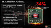 Besonderes Augenmerk legte AMD bei seinen neuen GPUs für Notebooks auf den Energieverbrauch. Das Trio AMD "Enduro", "PowerGate" und "ZeroCore" erlaubt den Notebook-GPUs der Serie Radeon HD 7000M sowohl eine teilweise Abschaltung nicht benötigter GPU-Bereiche, als auch eine vollständige Abschaltung, quasi mit 0 Watt. Im Idle-Betrieb soll der Energieverbrauch um 86 Prozent sinken, im üblichen Alltagsgebrauch eines Notebooks soll das Energieeinsparungspotential bei bis zu 34 Prozent liegen.