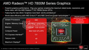 Die Radeon HD 7900M Serie tritt mit 1.280 Stream-Prozessoren und einer Taktung von 850 MHz an. Bis zu 2,176 Milliarden Gleitkommaoperationen pro Sekunde (GFLOPS) schreibt AMD der Radeon HD 7900M in das Pflichtenheft. Als Videospeicher nutzt die HD 7900M bis zu 2 GByte GDDR5-Speicher, der mit 256 Datenleitungen angebunden ist. Weiter nennt AMD 80 Textureinheiten (TMUs) und 32 Rasterendstufen (ROPs).