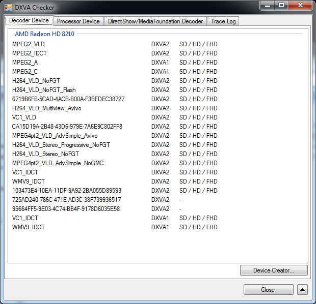 Der integrierte Avivo HD Video Decoder UVD 4.2 unterstützt unter Windows die Formate MPEG2, H264, VC1, MPEG4p2 und WMV9 in SD, HD (720p) und FHD (1080p) über die DXVA Schnittstelle (siehe DXVA Checker Screenshot). Im Benchmark konnte das Big Buck Bunny Video in h264 und 1080p mit flüssigen 23 -44 fps bei etwa 12 % CPU Last abgespielt werden. Die CPU Leistung alleine reicht für Full HD Videos aber manchmal nicht aus. Auf unserem Testsystem mit 2 GB RAM und langsamer 250er HDD hatten wir mit VLC immer wieder verlorene Frames (auch ohne Resource Monitor).