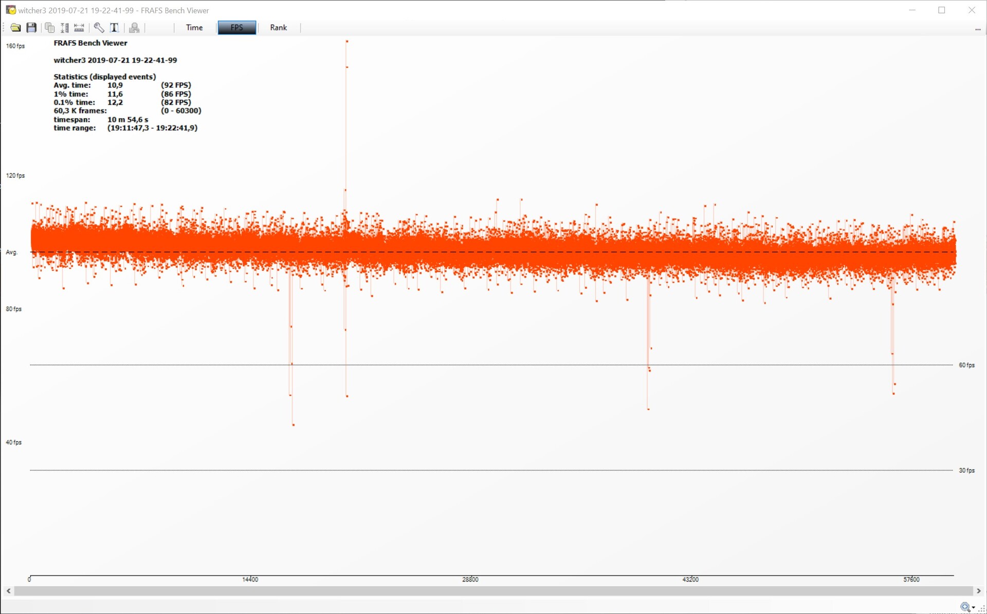 Die Frametimes und der Frameverlauf, den wir mit The Witcher 3 (Ultra-Preset) dokumentiert haben, ist besser als bei der GeForce RTX 2070S. Weniger Peaks sind das Ergebnis und die einzelnen Ausreißer sind für den Anwender nicht zu merken. Gleiches gilt für den Frameverlauf, wenngleich sich beim Betrachten des Diagramms schon ein leichter Leistungsverlust andeutet. Mit durchschnittlich 92 FPS ist ruckelfreies Spielen jedoch noch garantiert.