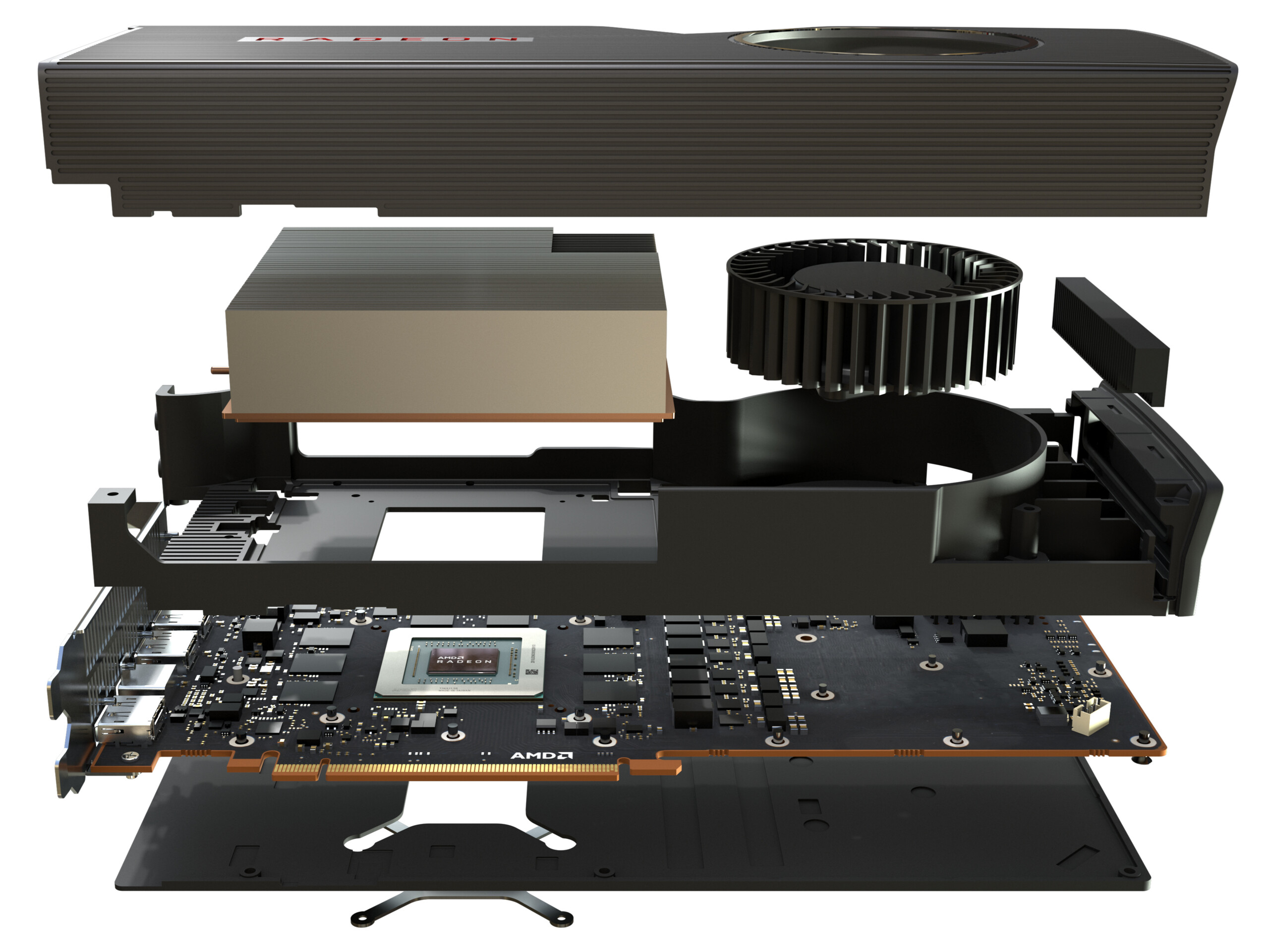 Die AMD Radeon RX 5700 XT ist mit einer Leistungsaufnahme von 225 Watt (TGP) angegeben und liegt damit knapp über der RTX 2070S FE (215 Watt). Das Kühldesign der Radeon RX 5700 Serie basiert weiterhin auf einem Radiallüfter-Konstrukt, welches die Abwärme direkt aus dem Gehäuse befördert. Eine Vapor-Chamber-Einheit befindet sich direkt über dem GPU-DIE, um die entstehende Hitze schnell wegzubekommen.