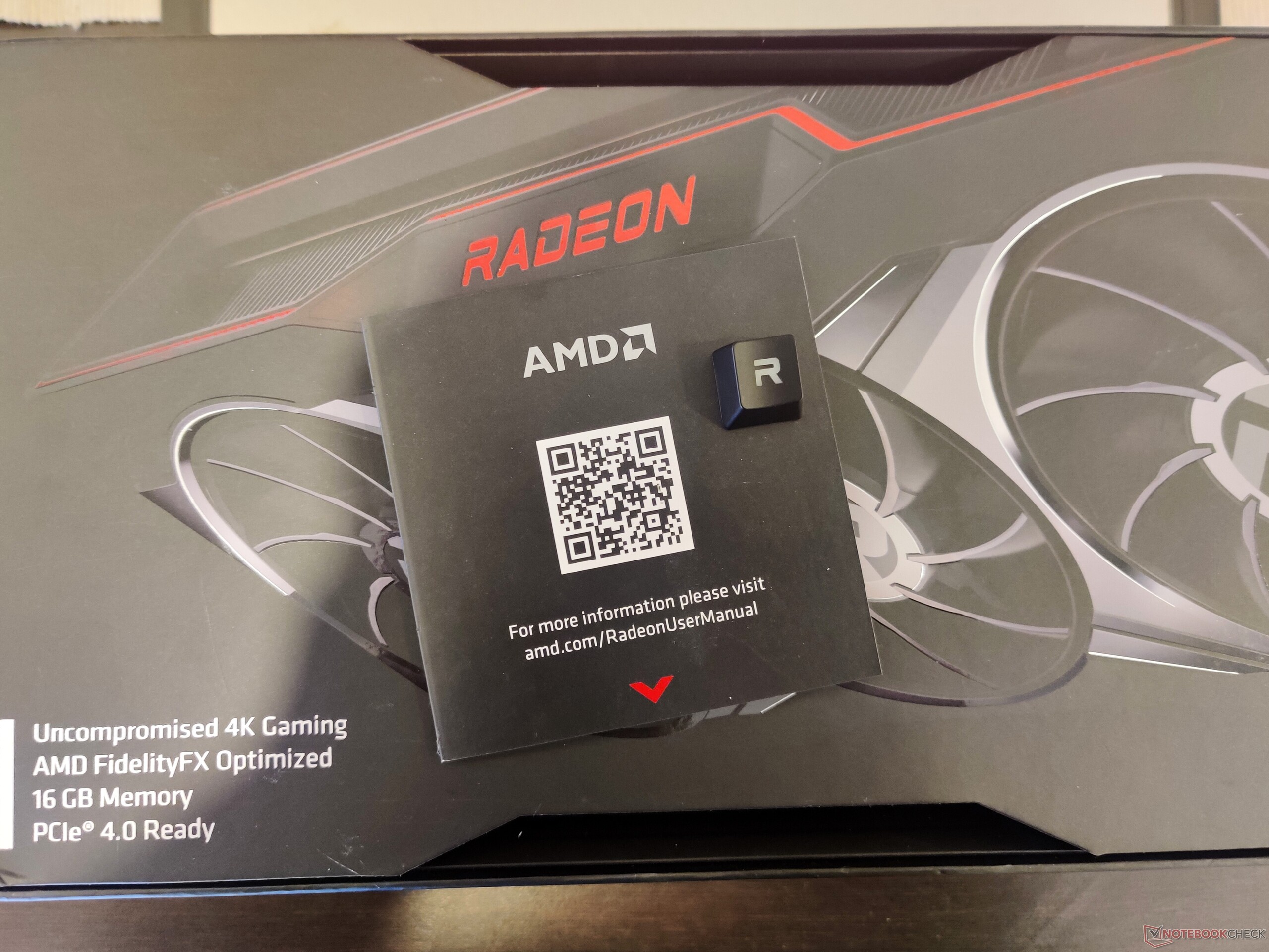 Beim Öffnen der Verpackung werden wir mit der Nachricht "Welcome to the Red Team" ("Willkommen bei Team Rot") begrüßt. Das Paket beinhaltet eine Radeon-Pappschachtel mit einem Schnellstartanleitung sowie einer AMD-designten "R"-Taste für eine Tastatur. Die "R"-Taste ist natürlich in der typischen Radeon-Schriftart designt und erlaubt die Beleuchtung mittels RGB-Licht. Leider fand sich in unserer Verpackung kein Mauspad mit AMD-Branding, aber das sollte in der endgültigen Verkaufspackung mit dabei sein.