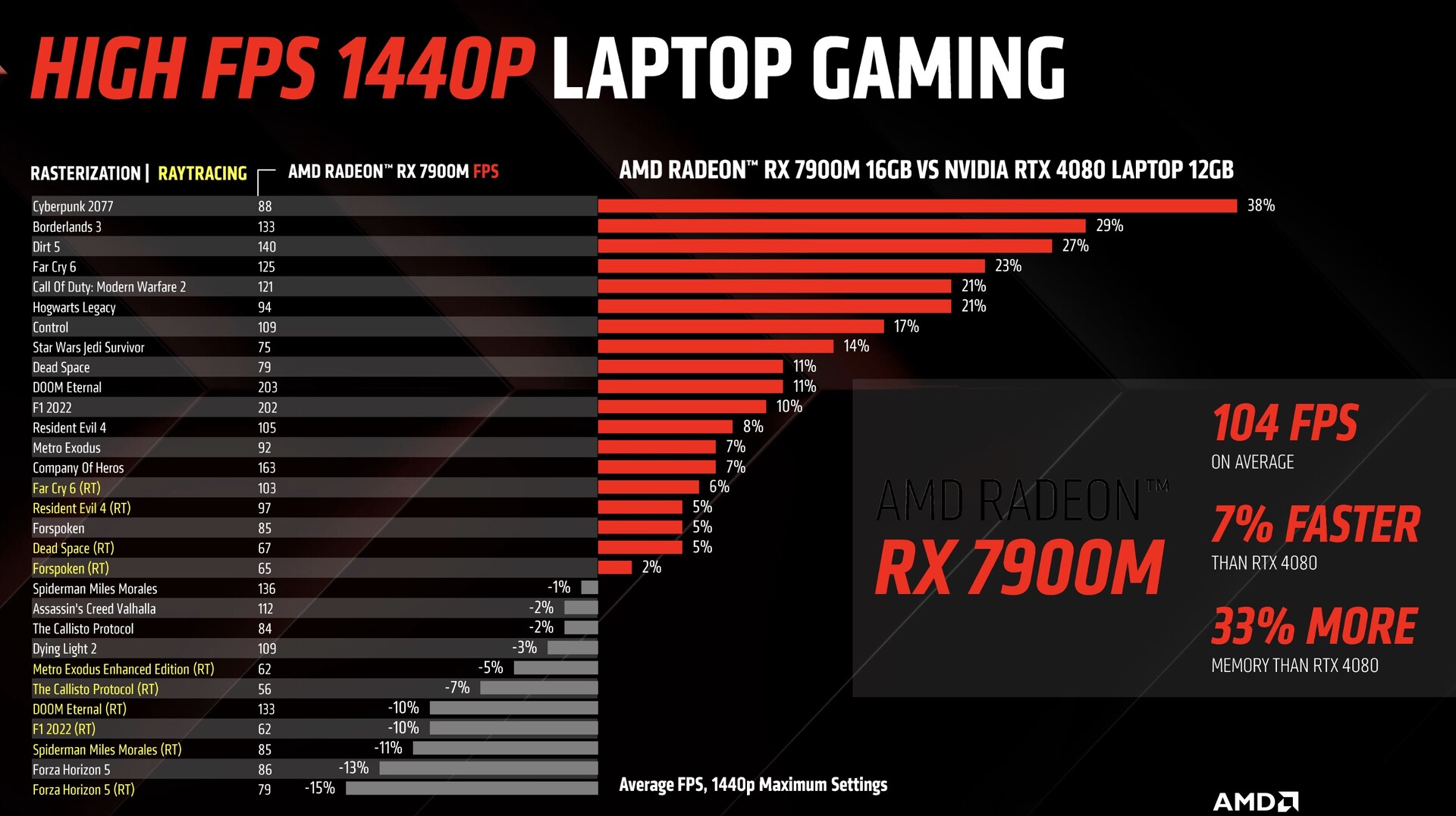 Die Spieleleistung wird von AMD mit einer mobilen RTX 4080 verglichen und soll im Schnitt um 7% schneller sein. Die Raytracing Performance hat sich mit RDNA 3 zwar deutlich erhöht, kann mit Nvidia jedoch noch nicht mithalten und DLSS bleibt weiterhin ein großer Vorteil von Nvidia.