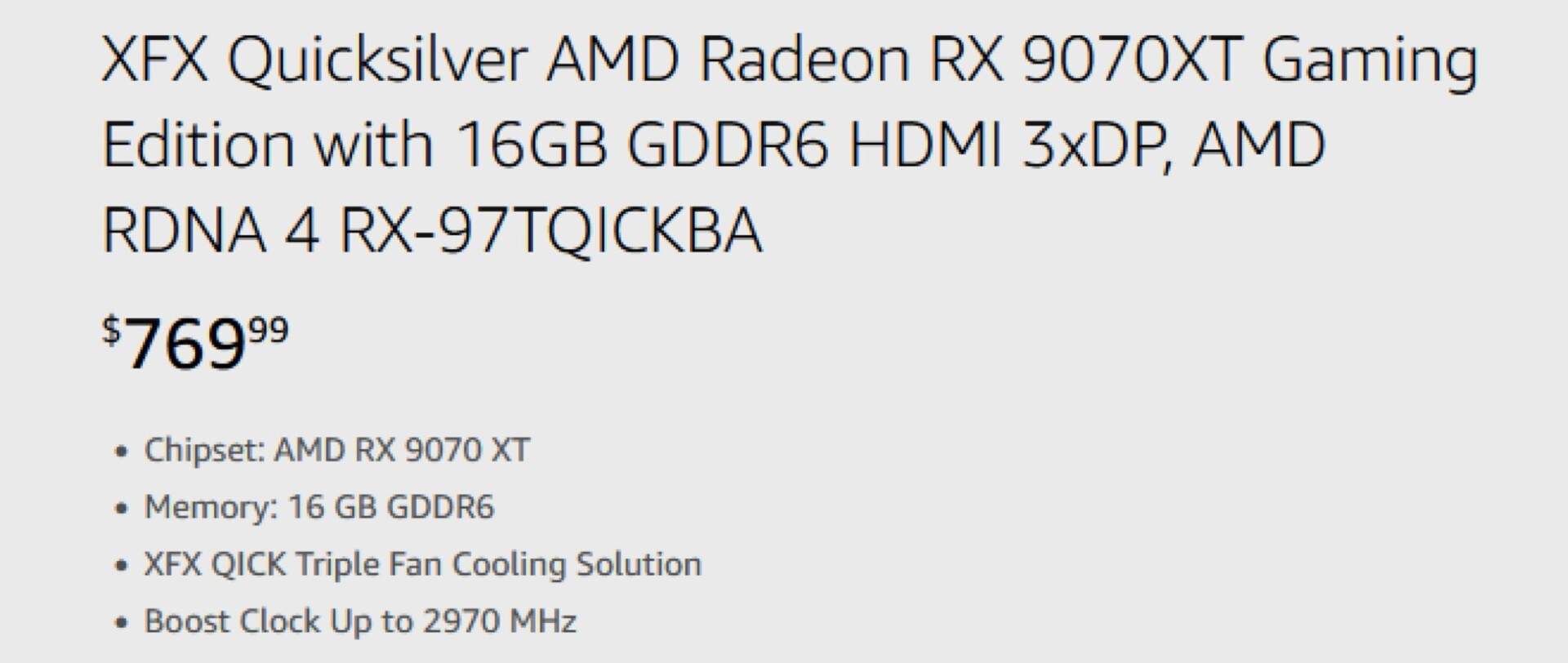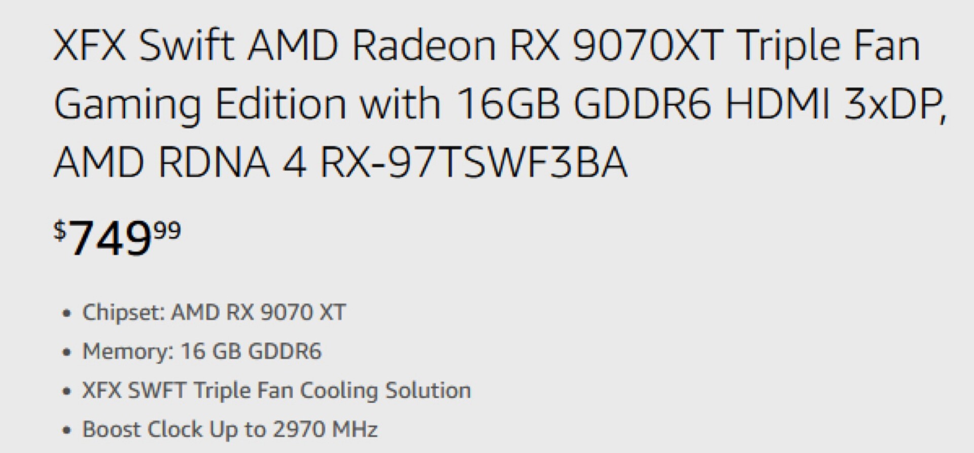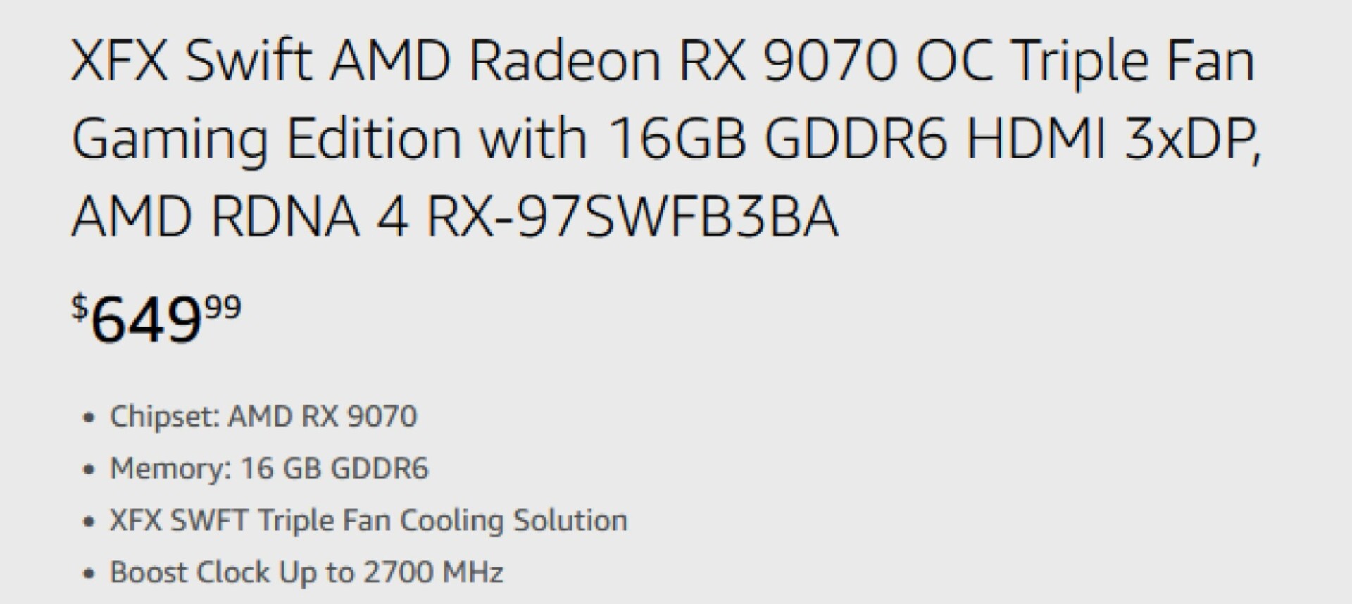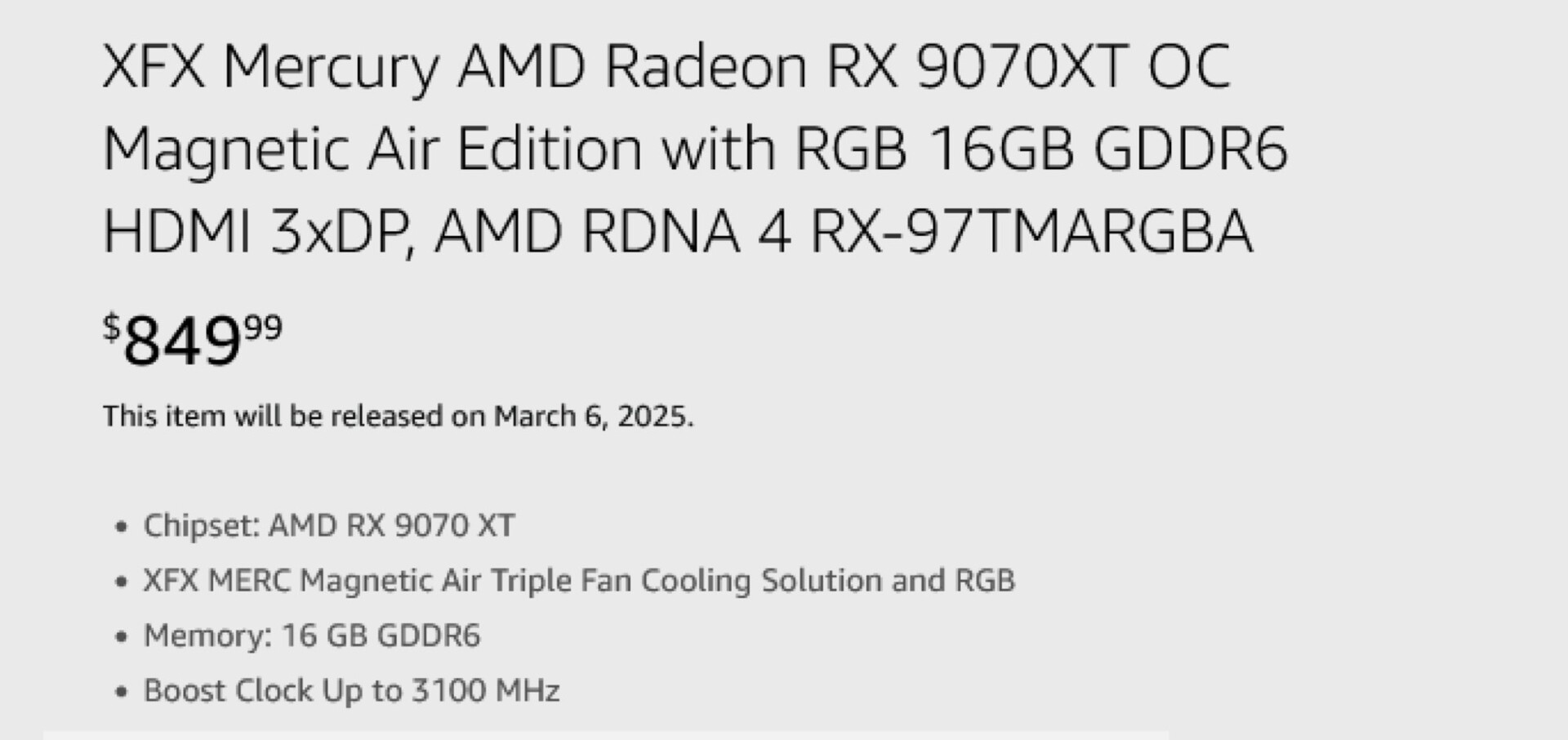 Die Produkte wurden zwar kurz darauf von Amazon entfernt, einer der Einträge deutet aber auf einen Verkaufsstart am 6. März. Diese Angabe passt perfekt zu früheren Gerüchten. Laut Amazon kostet eine XFX Swift OC Version der Radeon RX 9070 mit 16 GB GDDR6-Grafikspeicher und Boost-Taktfrequenzen bis 2.700 MHz 649,99 US-Dollar, womit die Grafikkarte exakt zwischen der Nvidia GeForce RTX 5070 und der GeForce RTX 5070 Ti positioniert werden würde. Die günstigste Radeon RX 9070 XT, bei der es sich ebenfalls um eine XFX Swift OC mit drei Lüftern handelt, wird für 749,99 US-Dollar gelistet, und ist damit gleich teuer wie die Nvidia GeForce RTX 5070 Ti Founders Edition.