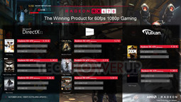 Die Radeon RX 470 soll sich insbesondere durch ihre höhere Leistung gegenüber Nvidias Einstiegslösung durchsetzen. AMD verspricht eine bessere Gaming-Erfahrung aufgrund der Bereitstellung von über 60 FPS unter FullHD inklusive aktivierter Kantenglättung bei aktuellen Spielen. Des Weiteren profitieren DirectX-12-Titel auf AMDs Polaris-Grafikkarten von den vorhanden Asynchronous Shadern, welche Nvidias Pascal-Architektur nicht bietet. In diesem Zusammenhang wird die kontinuierlich höhere Leistungsfähigkeit gegenüber den entsprechenden Konkurrenzprodukten in Battlefield 1 hervorgehoben. Die Präsentation endet mit einer Gegenüberstellung der relativen Performance aller erwähnten Grafikkarten zueinander.
