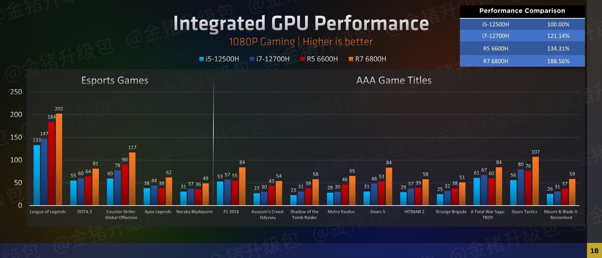 Wie die unten eingebetteten Gaming-Benchmarks zeigen kann selbst die langsamere der beiden iGPUs bei den meisten Spielen die Performance der Intel Iris Xe Graphics G7 übertreffen, die man beispielsweise im Intel Core i7-12700H findet. Bei 1.080p-Auflösung mit niedrigen Details können mit der Radeon 680M selbst Spiele wie Assassin's Creed Odyssey, Metro Exodus und Hitman 2 mit rund 60 Bildern pro Sekunde dargestellt werden, während die iGPU von Intel nur auf knapp 30 fps kommt.