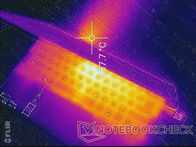 Die Oberflächentemperaturen unter Last können in der Nähe der Tastaturmitte und der Rückseite bis zu 45 bis 50 °C betragen, ähnlich wie beim XPS 13 9310 2-in-1. Interessanterweise kann das WLAN-Modul sogar im Leerlauf auf dem Desktop recht warm werden, wie unsere Bilder unten zeigen, vielleicht aufgrund von Software-Downloads im Hintergrund.