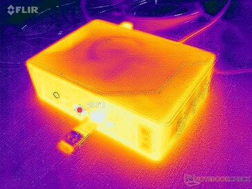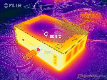 Bei Volllast bewegen sich die Lüfter im Bereich von 36 dB(A) und 43 dB(A), was zwar genau so laut wie der Intel NUC 13 Pro, aber deutlich hörbarer als der Minisforum Mercury Series EM68 ist. Für Laptops mit CPUs der U-Serie sind Lautstärken im unteren 40-dB(A)-Bereich aber bei ähnlicher Last typisch.