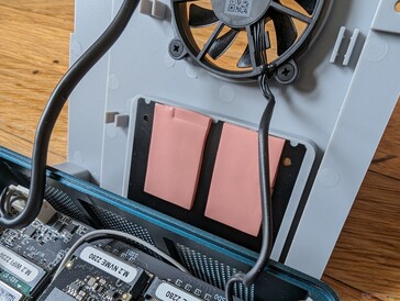 Zwei verschiedene Abdeckungen müssen entfernt werden, um zum Motherboard zu gelangen: Zuerst den äußeren Teil des Gehäuses und anschließend die Lüfterabdeckung (siehe auf den Bildern unten). Beides kann aber relativ einfach mit einem herkömmlichen Schraubenzieher gelöst werden. Hat man es so weit geschafft, hat man die Möglichkeit, bis zu zwei SODIMM-Module, zwei M.2-2280-PCIe4-x4-NVMe-SSDs oder ein WLAN-Modul zu verbauen.