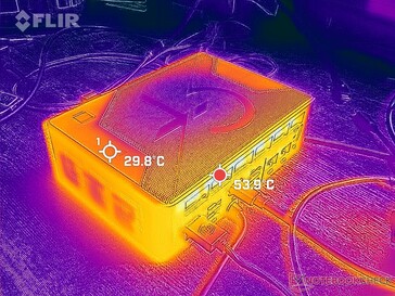Der Ryzen 7 7840HS ist zwar pfeilschnell, doch benötigt auch einiges an Energie. Verglichen mit dem Ryzen 7 7735H im SER6 verbraucht der GTR7 knapp 30 Prozent mehr Strom bei Spielen und fast 50 Prozent mehr beim Prime95 Stresstest. Dies bedeutet, dass das Gerät definitiv zu der Gruppe der ziemlichen stromgierigen Mini-PCs gehört (abgesehen von jenen mit dedizierter Grafikeinheit).