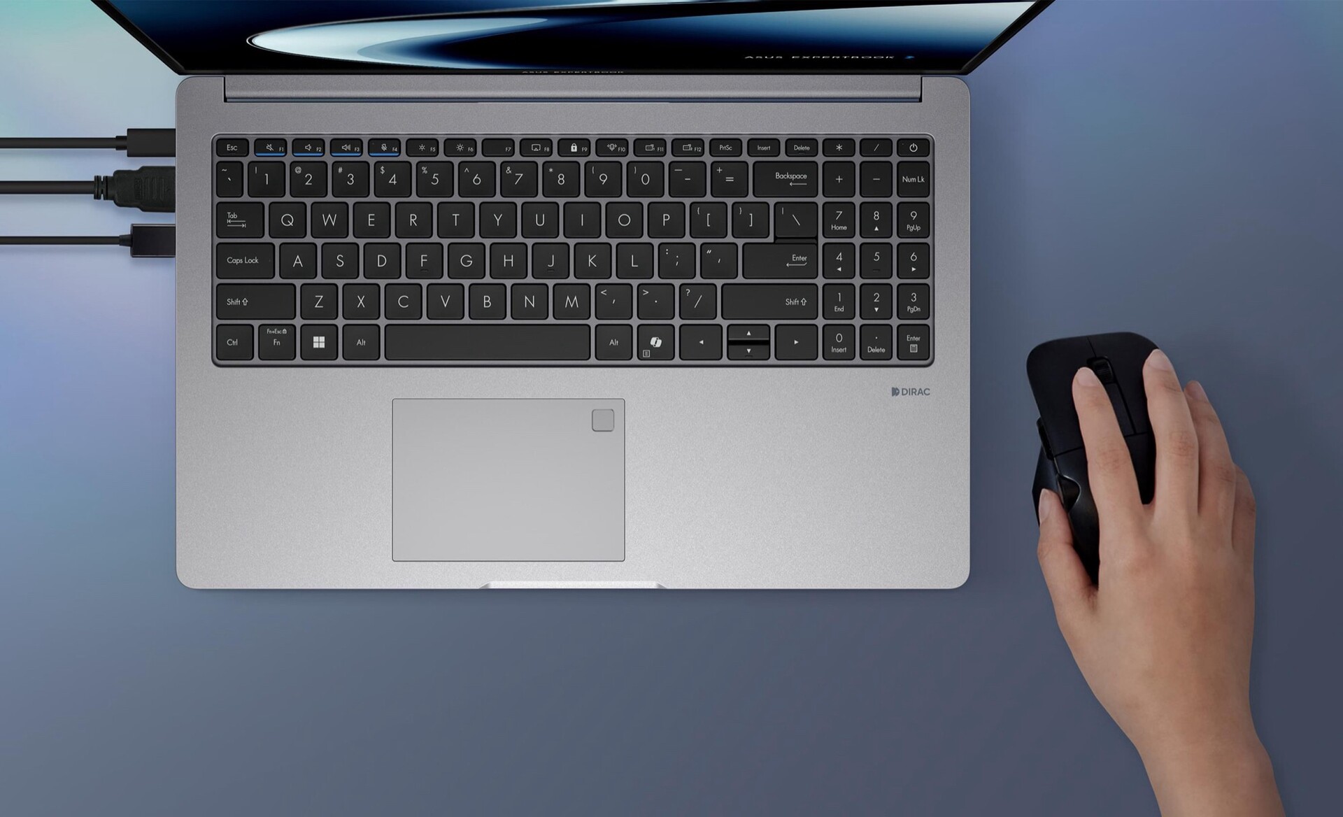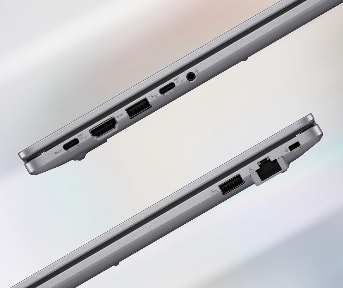 Das 1,99 Kilogramm dicke, 1,6 Kilogramm schwere Notebook besitzt einen 50 Wh Akku. Neben Wi-Fi 6E und Bluetooth 5.4 bietet das ExpertBook PM1 auch zweimal USB-A (5 Gbit/s), zweimal USB-C (10 Gbit/s) inklusive DisplayPort und 65 Watt Power Delivery, HDMI 1.4, Gigabit Ethernet und einen 3,5 mm Kopfhöreranschluss. Die 1.080p-Webcam besitzt eine Privatsphäre-Abdeckung, ein Fingerabdrucksensor im Trackpad beschleunigt den Windows-Login.