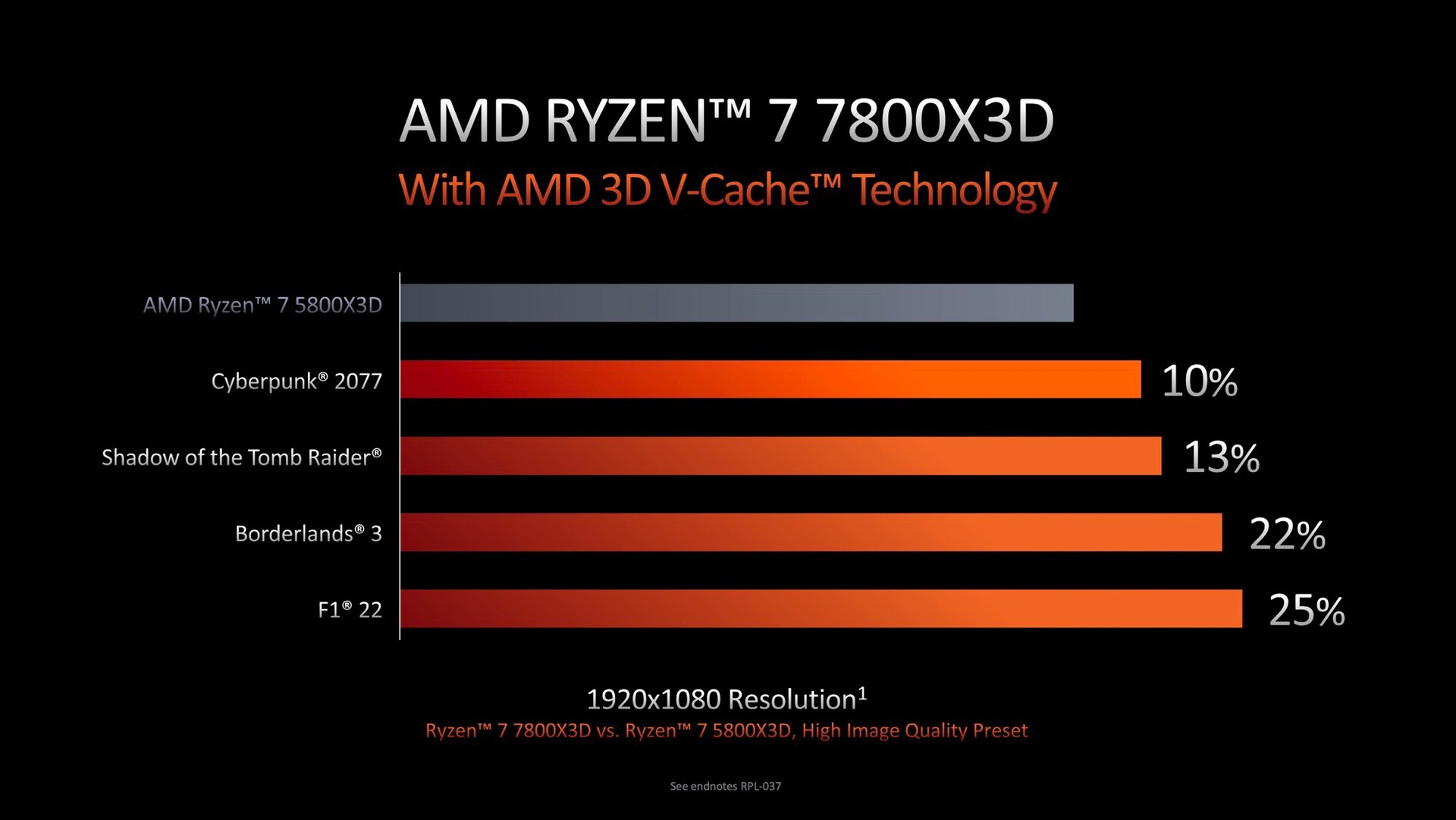 Beide Testsysteme wurden in AMDs Benchmark-Vergleich mit demselben Arctic Liquid Freezer II Kühler und mit 32 GB DDR5-6000-Arbeitsspeicher ausgestattet. Der erschwinglichere Ryzen 7 7800X3D soll im Schnitt eine 15 Prozent höhere Bildrate erzielen als noch der Ryzen 7 5800X3D, im Bestfall steigt die Performance sogar um 30 Prozent.