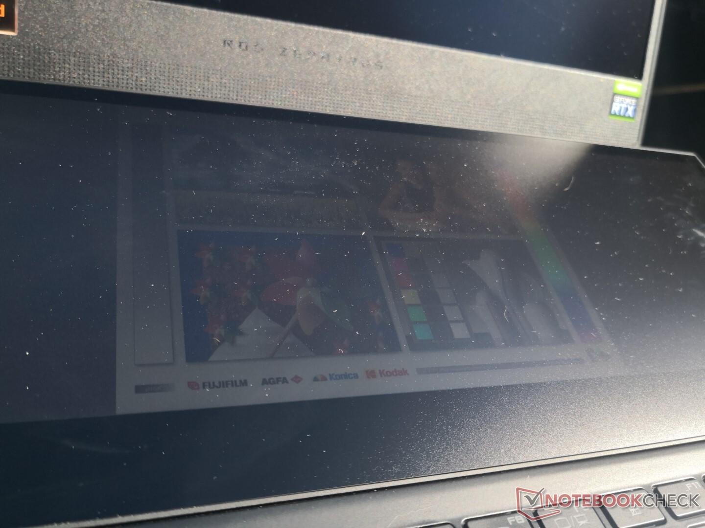 Da es sich beim Panel des ScreenPads um das exakt gleiche Modell wie beim GX550 handelt, gelten unsere bestehenden Anmerkungen zu diesem auch hier. Erwähnenswert ist vor allem, dass das Farbspektrum auf den sRGB-Farbraum und die Bildwiederholfrequenz auf 60 Hz beschränkt ist, wohingegen das Hauptdisplay den gesamten AdobeRGB-Farbraum abdeckt und eine Bildwiederholfrequenz von 120 Hz unterstützt. Die Reaktionszeiten sind messbar langsamer als die des Hauptdisplays, wodurch die Schlierenbildung stärker auffällt. Aufgrund der dickeren, matten Schicht wirken Bilder und Texte außerdem körniger. Obwohl der zweite Bildschirm für Multi-Tasking-Aufgaben unersetzlich ist, weichen die Farben, der Kontrast und sogar die Helligkeit des ScreenPads leicht ab.