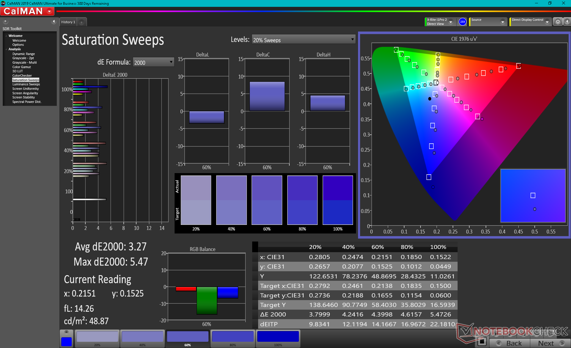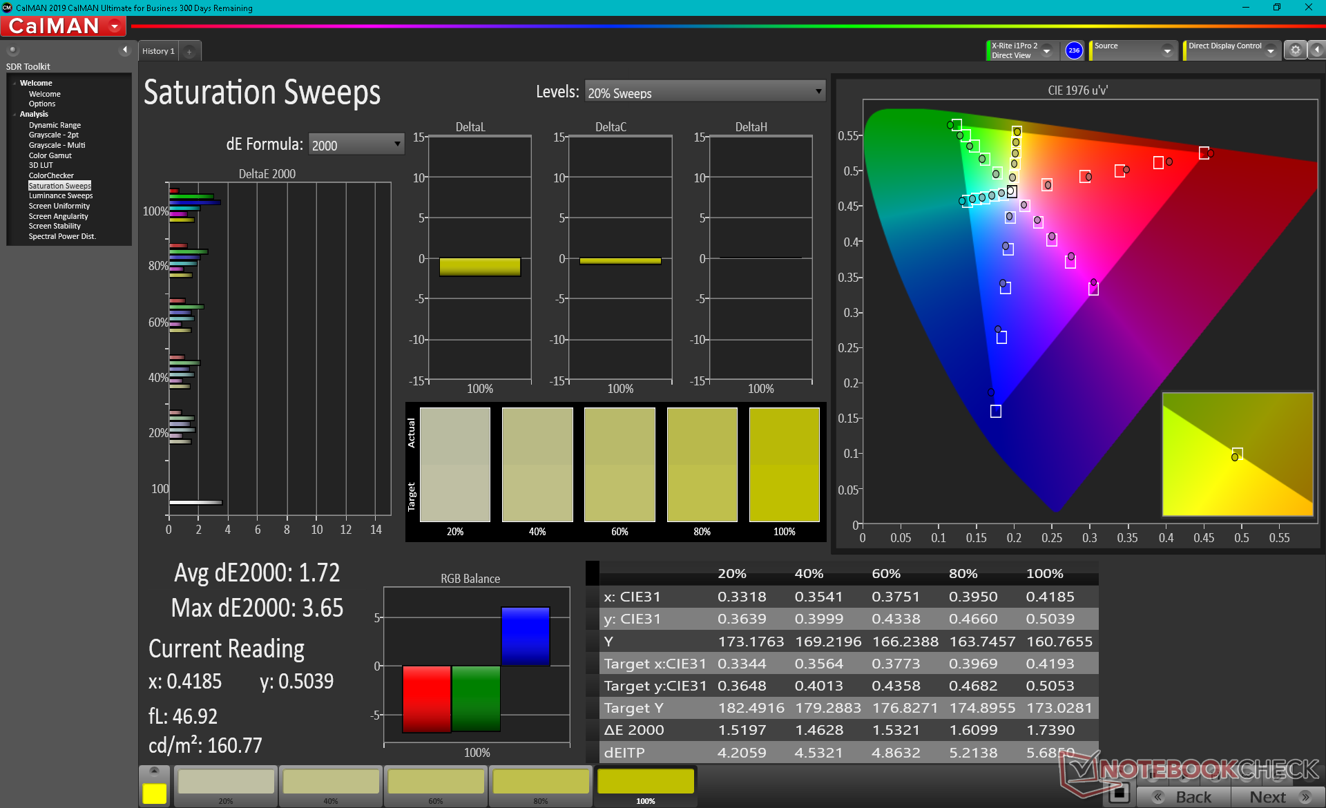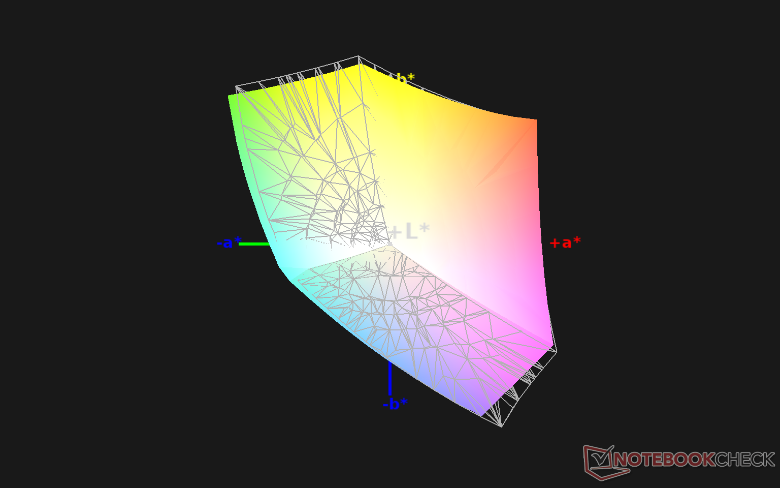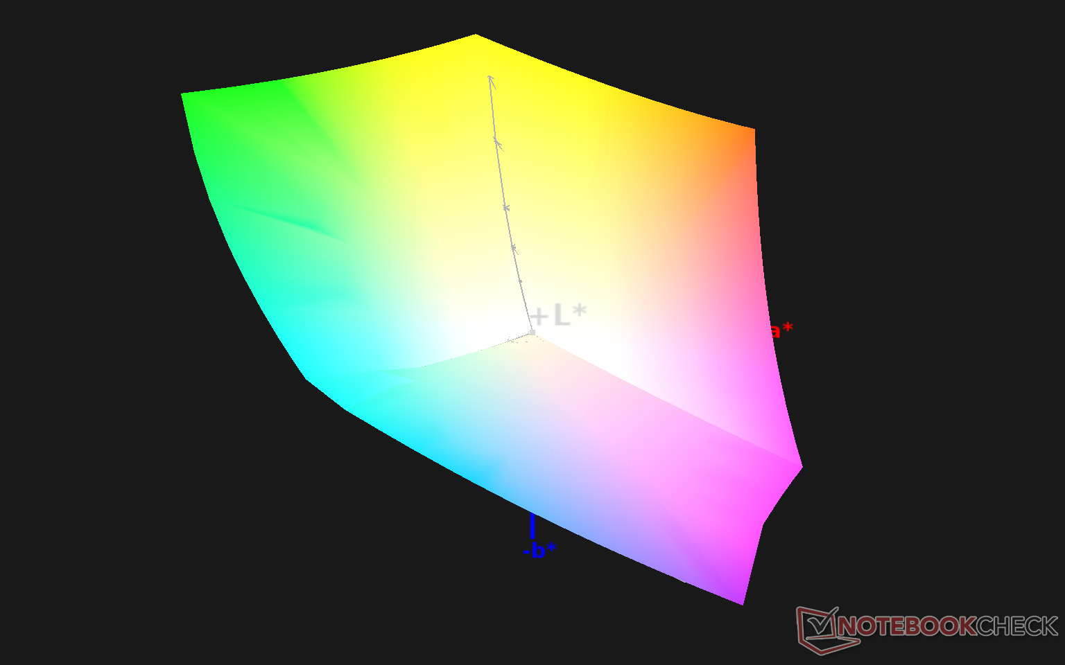 Ähnlich wie die meisten Flaggschiff-Ultrabooks und 4K-Laptops wird auch hier fast der gesamte AdobeRGB-Farbraum abgedeckt. Da eine gute Farbwiedergabe unter diesen Panels üblich ist, sind es die schnellen Schwarz-zu-Weiß- und Grau-zu-Grau-Reaktionszeiten, die den Bildschirm unseres Asus-Laptops so besonders machen.