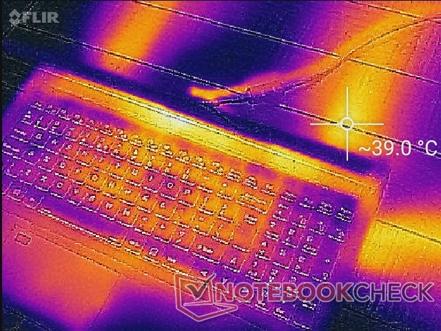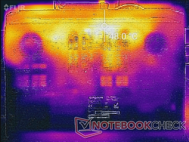 Im Modus "Power Saving" bzw. "Quiet" sind die Oberflächen auch im Leerlauf relativ warm, da die Lüfter ihre Leistung dann stark zurückfahren. Die wärmsten Stellen erreichen bis zu 27 °C und 43 °C auf der Ober- bzw. Unterseite. Obwohl die Tastatur damit immer warm ist, wird sie zum Glück nie unangenehm warm, da die lauten Lüfter die Oberflächentemperaturen auch unter hoher Last im grünen Bereich halten.