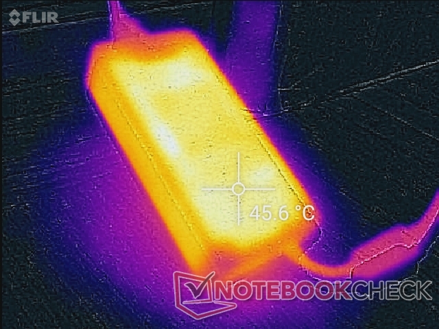 (-) Auf der Unterseite messen wir eine maximalen Wert von 49.6 °C (im Vergleich zum Durchschnitt von 43.3 °C).