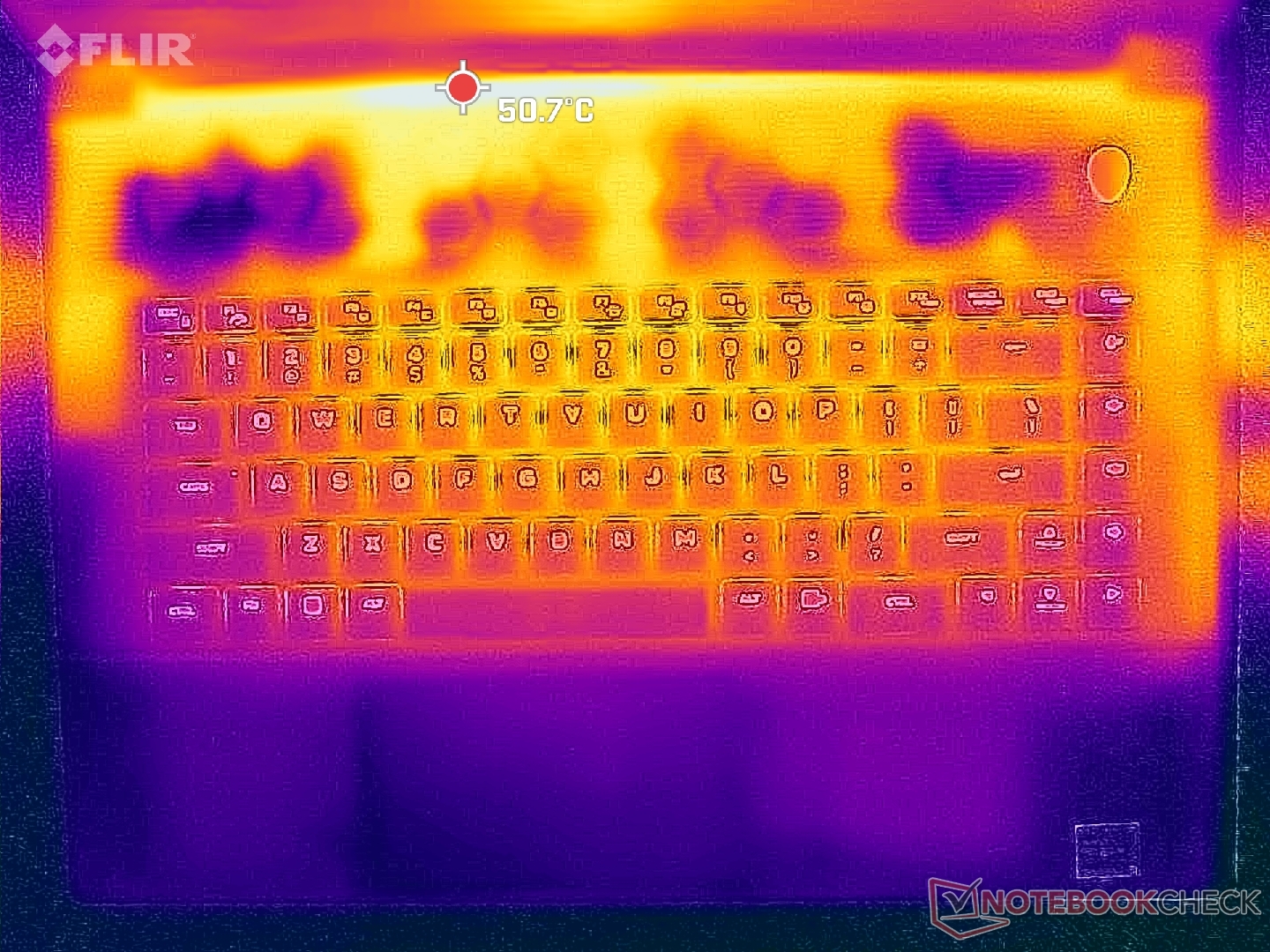 Die Oberflächentemperaturen können auf der Rückseite bis zu 50 °C erreichen und somit sehr warm werden. Glücklicherweise bleiben die Handballenauflagen und der Tastaturbereich kühler, was einen besseren Komfort bietet. Dies ist teilweise auf die großzügigen Lüftungsgitter zurückzuführen. Beim Spielen erreicht beispielsweise die Mitte der Tastatur eine Temperatur von 42 °C, verglichen mit 46 °C beim Lenovo Legion Pro 7 16.