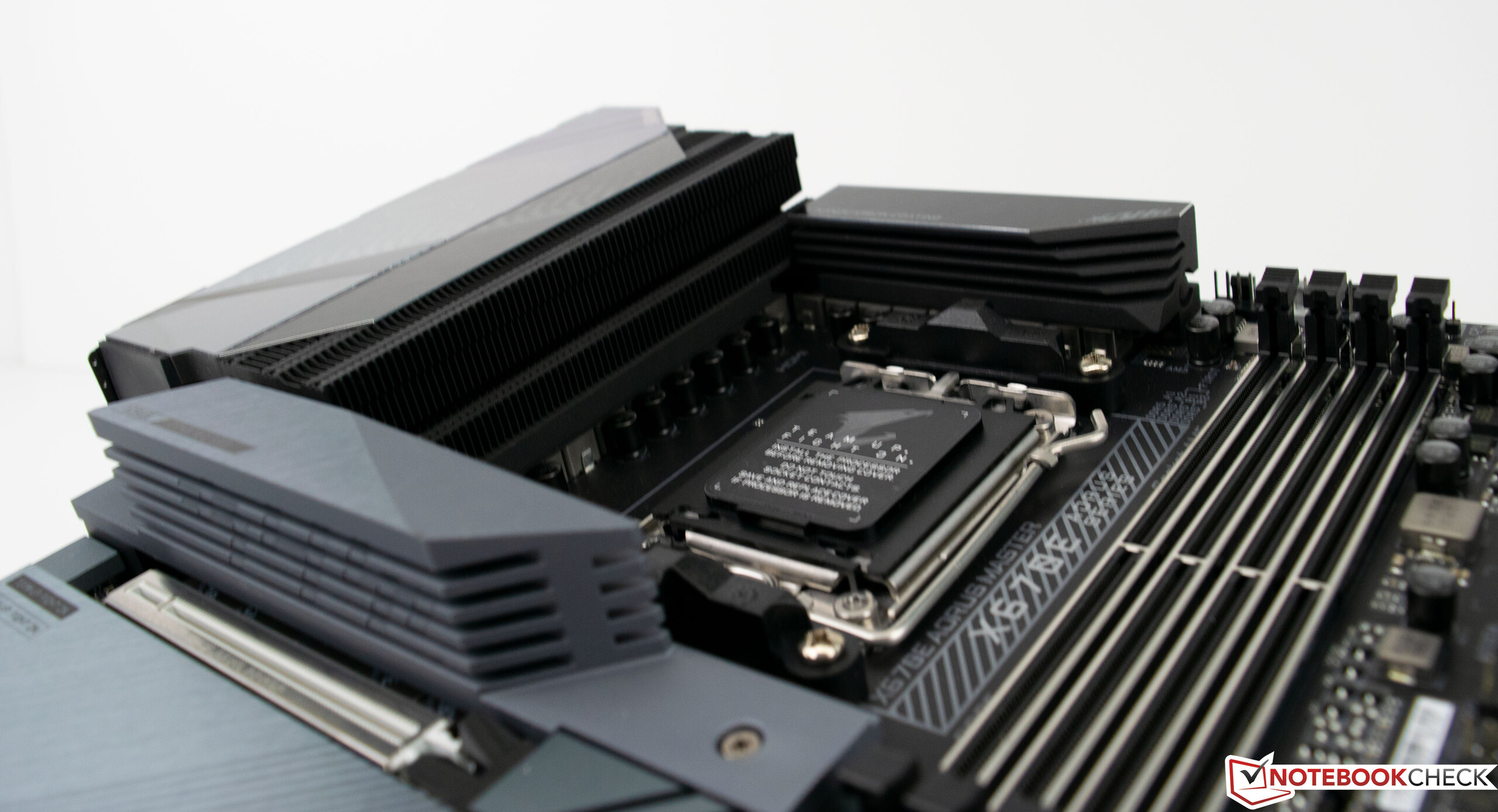 Als Unterbau für unseren Test benutzen wir das Gigabyte X670E Aorus Master. Das Mainboard bietet alle neuen Features, die mit den neuen AMD-Ryzen-Prozessoren Einzug halten. Dazu zählt die Unterstützung von PCIe 5.0, das von zukünftigen SSDs aber auch Grafikkarten genutzt wird. Insgesamt wird es mit dem X670, dem B650E und dem B650 vier verschiedene Chipsätze geben. Die preiswerteren Platinen werden allerdings erst in den nächsten Wochen auf den Markt kommen. Das Flaggschiff von Gigabyte bietet mit dem X670-Extreme-Chipsatz 16+2+2 Phasen, um die Stromversorgung des Prozessors auch bei extremen Übertaktungen zu gewährleisten. Die Spannungswandler befinden sich unter einem massiven Kühlkörper, womit wir auch unter Last keine Temperaturprobleme hatten. Insgesamt lassen sich bis zu vier M.2-SSD direkt auf dem Mainboard verstauen. Gleichwohl bietet aber nur der erste M.2-Steckplatz den neuen PCIe-5.0-Support. Eine aktive Kühlung des Chipsatzes, wie es noch bei X570 der Fall war, gibt es beim Gigabyte X670E Aorus Master nicht. Der neue LGA-Sockel aka AM5 bietet 1.718 Kontaktflächen und ist mit älteren AM4-Kühlern kompatibel. Zudem hat AMD im Rahmen der Produktvorstellung auch über die Nutzungsdauer des neuen AM5-Sockels geredet. Dieser soll bis mindestens 2025 erst einmal als Basis dienen.