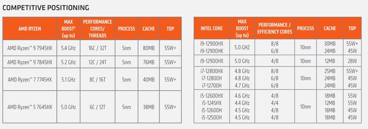 Der Ryzen 7 7745HX wurde mit dem Intel Core i7-12700H verglichen, der nicht nur älter ist, sondern auch mit einer geringeren TDP betrieben wird. AMD verspricht einen Vorsprung von 6 Prozent (Single-Core) respektive 25 Prozent (Multi-Core), nachdem der Core i7-13700HX aber zwei zusätzliche Performance-Kerne besitzt und höhere Taktraten als der Core i7-12700H erreicht, dürfte das Rennen mit dem tatsächlichen Konkurrenten weitaus knapper werden.