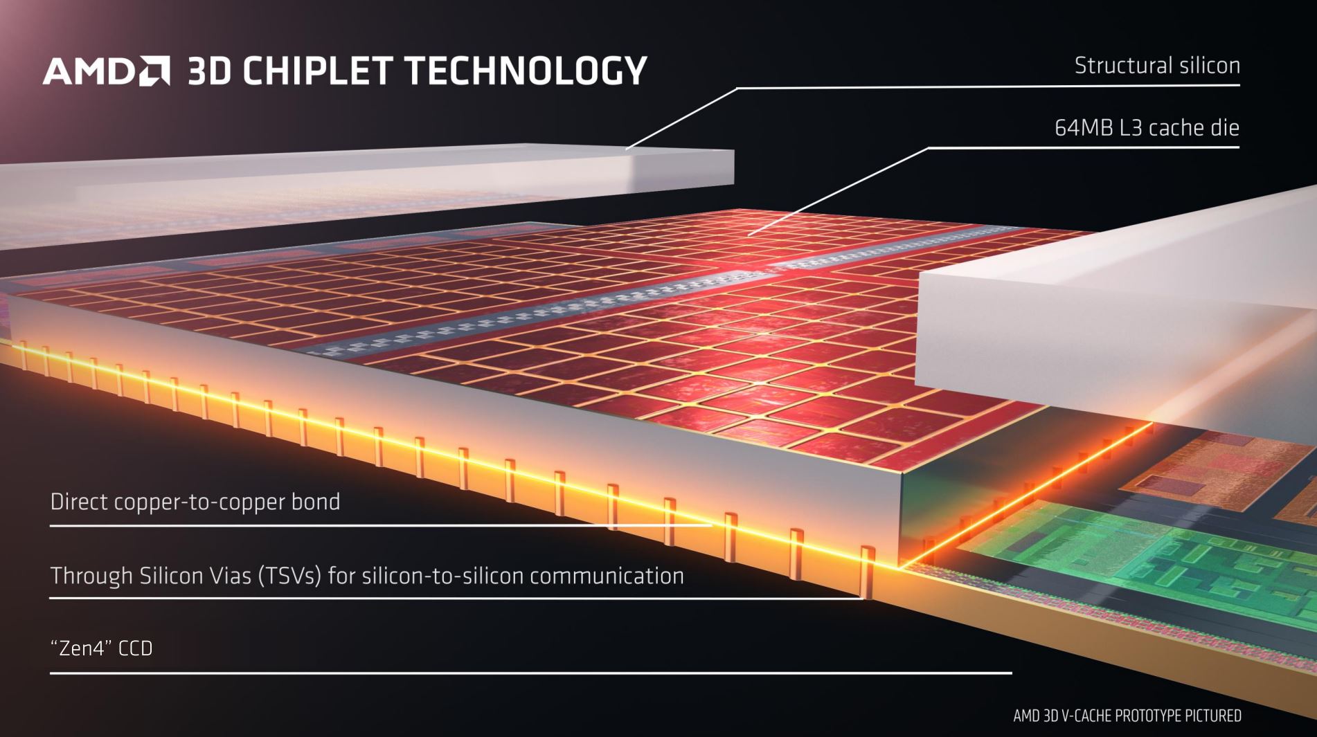 Im Desktopbereich bietet AMD seit dem letzten Jahr bereits CPUs mit 3D V-Cache an und nun folgt mit dem Ryzen 9 7945HX3D auch der erste Mobilprozessor mit dieser Technologie. Abgesehen von dem neuen 3D V-Cache (zusätzliche 64 MB) sind die Spezifikationen identisch zum normalen Ryzen 9 7945HX, es gibt also 16 Kerne/32 Threads mit einem maximalen Takt von 5,4 GHz. Im Fall des 7945HX3D wird der normale Cache (80 MB L2/L3-Cache) um weitere 64 MB L3-Cache erweitert. Dabei liegt das zusätzliche Cache-Modul direkt auf dem Zen4-CCD, welches im Vergleich zum regulären Zen4-CCD etwas dünner ausfällt, damit die Gesamthöhe identisch ausfällt. Neben dem zusätzlichen Cache befindet sich noch strukturelles Silikon, damit die Kühlkörper auf der gesamten Fläche aufliegen können. Vor allem bei hohe Frame-Raten soll damit die Leistung verbessert werden, da die Zugriffszeit verkürzt und neue Daten schneller bereitgestellt werden können.
