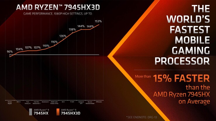 Laut AMD können Laptop-Hersteller den Chip mit einer höheren Verlustleistung betreiben, solange das Kühlsystem ausreichend Reserven bietet. Im Vergleich zum Ryzen 9 7945HX fügt der neue Chip 128 MB 3D V-Cache hinzu. Wie die Desktop-Prozessoren mit vergleichbarem Cache gezeigt haben, wirkt sich dieser bei vielen Spielen positiv auf die Gaming-Leistung aus. AMDs Marketing verspricht im Vergleich zu deaktiviertem 3D V-Cache eine durchschnittlich 11 Prozent höhere Bildrate bei einer Verlustleistung von 70 Watt, und sogar eine 23 Prozent höhere Leistung bei einer TDP von 40 Watt.