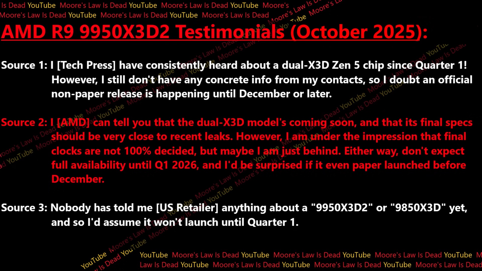 Unter Berufung auf Quellen aus dem Einzelhandel, von AMD und aus der Tech-Presse berichtet MLID, dass der eigentliche Marktstart des Ryzen 9 9950X3D2 nicht vor Dezember zu erwarten ist. Eine AMD-Quelle habe zwar angegeben, dass der Prozessor „bald kommt“, mit einer breiten Verfügbarkeit im Handel sei jedoch erst im ersten Quartal 2026 zu rechnen. Diese Quelle bestätigte außerdem, dass die bisher geleakten technischen Daten „nahe an der finalen Spezifikation“ liegen sollen – allerdings könnte AMD die angegebenen Taktraten noch anpassen.