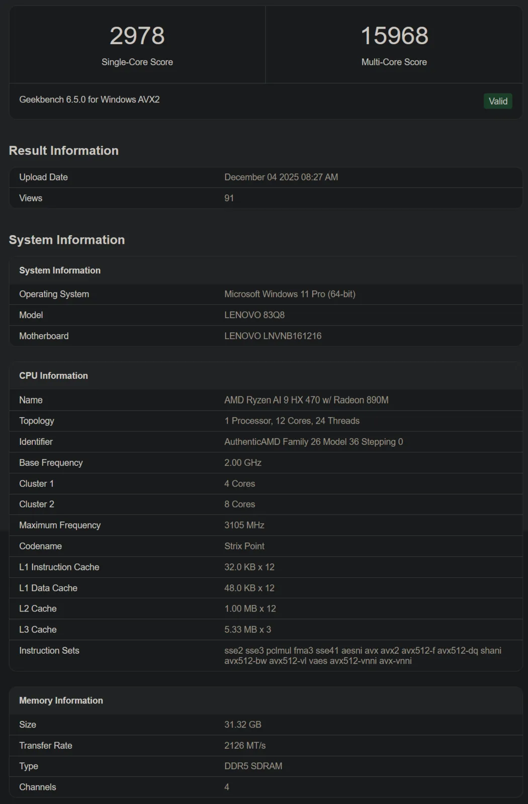 Der Anfang macht das Flaggschiff: der Ryzen AI 9 HX 470. Er erzielt 2.978 und 15.968 Punkte in den Geekbench Single- und Multi-Core-Tests. Das ist nahezu das gleiche Ergebnis wie beim Ryzen AI 9 HX 370 (2.890/15.051). Besonders aussagekräftig für die Leistung der Gorgon Point CPU ist das allerdings nicht, da sie nicht konstant auf ihre maximale Geschwindigkeit (5,3 GHz) hochgefahren wird. Sie wurde in Verbindung mit einem noch nicht veröffentlichten Lenovo Laptop mit 32 GB DDR5-2126 RAM im Benchmark-Test gesichtet, was sich wahrscheinlich auf das Geekbench-Ergebnis auswirkt.
