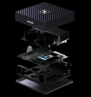 So sollen Modelle mit bis zu 200 Milliarden Parametern lokal ausgeführt werden können. AMD Ryzen AI Halo unterstützt sowohl Windows 11 als auch Linux. AMD kühlt den leistungsstarken Strix-Halo-Chip, der unter Last über 180 Watt Strom verbrauchen kann, mit zwei Lüftern und einem großen Kühlkörper. AMD integriert dezente Lüftungsöffnungen über den Großteil des Gehäuses, das gleich zwei AMD-Logos trägt. Als kleinen Design-Akzent verbaut AMD einen LED-Streifen.