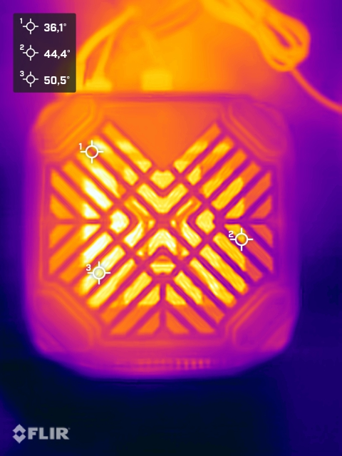 (+) Auf der Unterseite messen wir eine maximalen Wert von 38.2 °C (im Vergleich zum Durchschnitt von 36.2 °C).