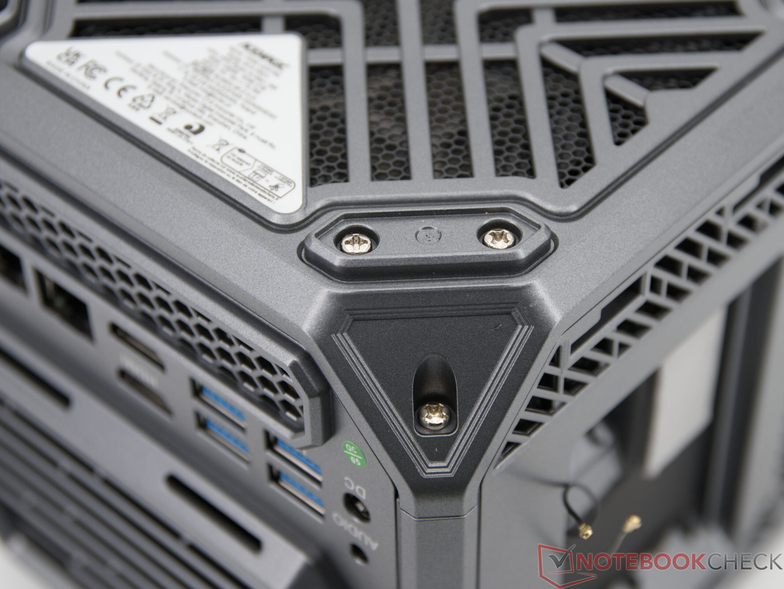 Der Acemagic M1A Pro+ besitzt zwei seitliche Wartungsklappen, die sich werkzeuglos öffnen lassen und direkten Zugriff auf SSD und WLAN-Modul ermöglichen. In unserem Testgerät sind noch zwei freie M.2‑Steckplätze vorhanden. Ein vollständiges Zerlegen des Gehäuses ist möglich, wenngleich dies sehr kompliziert ist. Viele Schrauben befinden sich unter den aufgeklebten Eckabdeckungen, die sich nur sehr schwer entfernen lassen, ohne Beschädigungen zu hinterlassen. Warum der Hersteller den vollständigen Zugang zum Innenraum erschwert, ist unverständlich – insbesondere im Hinblick auf mögliche Wartungsarbeiten wie Reinigung oder Lüftertausch.