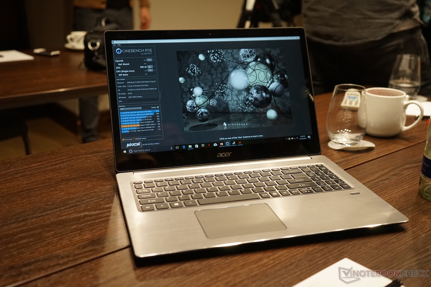Trotz 15 Watt Einstufung sollen die vier Kerne im Ryzen 7 2700U im Mehrkerntest des Cinebench R15 den Core i7-8550U deutlich schlagen können. AMD zeigte in der Präsentation Werte eines Acer Spin 5, wobei diese im Vergleich mit unseren gemessenen i7-8550U Benchmarks jedoch etwas niedrig sind. Trotzdem bleibt in allen Fällen ein deutlicher Vorsprung.