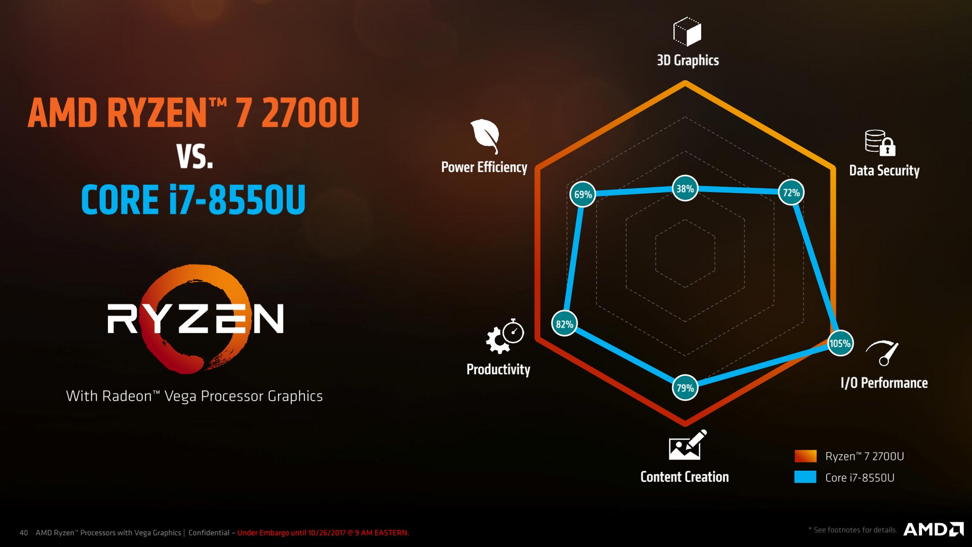 Antreten muss man gegen die neuen Quad-Cores von Intel der 8. Generation (Kaby Lake-Refresh). Raven Ridge startet mit zwei 15 Watt APUs namens Ryzen 5 2500U und Ryzen 7 2700U und tritt damit direkt gegen den Core i5-8250U und Core i7-8550U an. Den Vorgänger Bristol Ridge möchte man damit in allen Belangen deutlich übertreffen.
