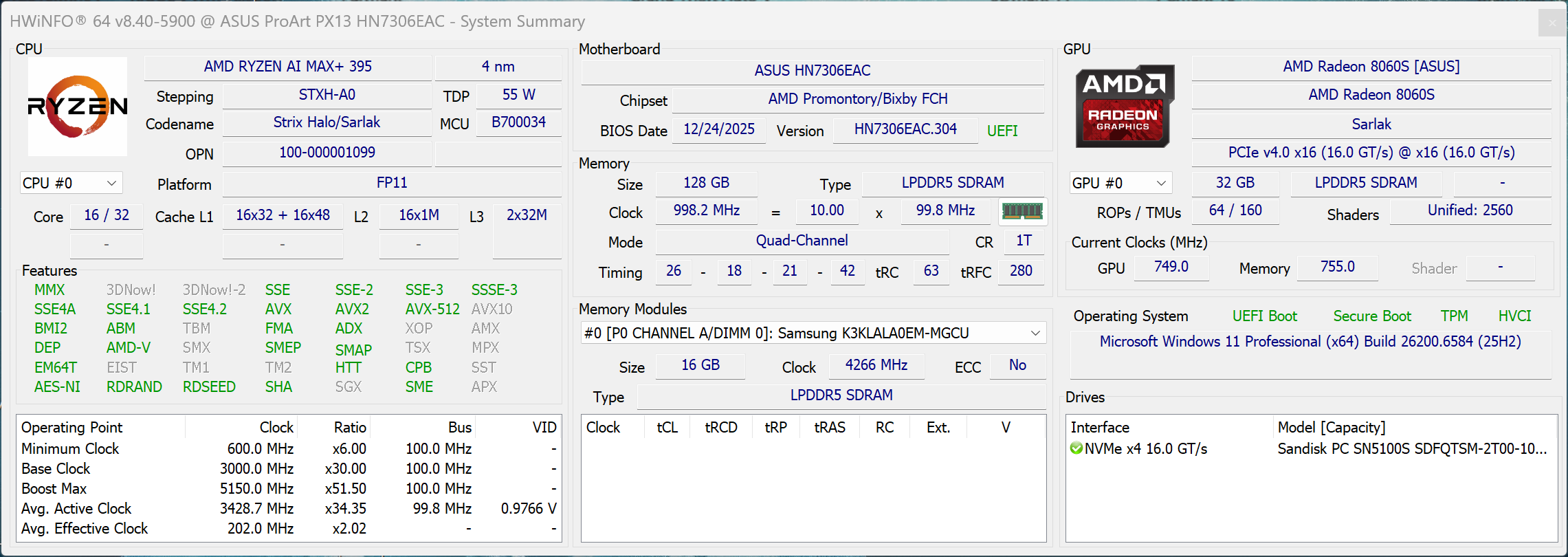 | Asus ProArt PX13 HN7306EA AMD Ryzen AI Max+ 395 ⎘ AMD Radeon 8060S ⎘ 128 GB RAM, 2048 GB SSD | Amazon: 1. dekoelektropunktde 512GB M.2... 2. dekoelektropunktde 512GB M.2... 3. dekoelektropunktde 1TB M.2 N... Bestpreis 2799€ computeruniverse.net 2. 2799€ Cyberport Stores Deutschland 3. 2799€ Cyberport.de | 1.4 kg | 17.7 mm | 13.30" 2880x1800 255 PPI OLED | |
