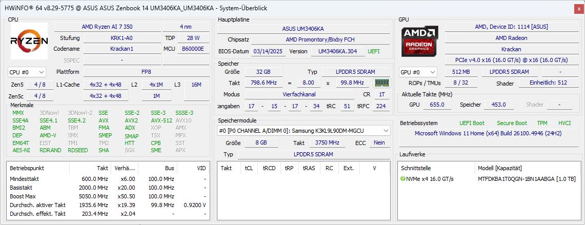 | Asus ZenBook 14 OLED UM3406K, Ryzen AI 7 350 AMD Ryzen AI 7 350 ⎘ AMD Radeon 860M ⎘ 32 GB RAM, 1024 GB SSD | Amazon: Bestpreis 1199€ computeruniverse.net 2. 1199€ Cyberport.de 3. 1199€ Cyberport.at | 1.2 kg | 14.9 mm | 14.00" 1920x1200 162 PPI OLED | |