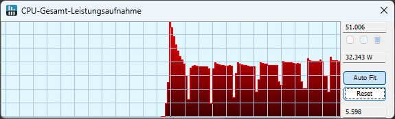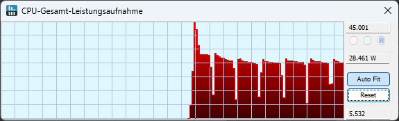 Beim Start des Stresstests steigt die Leistungsaufnahme nur für eine Sekunde auf 45 W, liegt dann für etwa 2 s bei 32 W und fällt schließlich auf ab da an konstante 20 W für den Rest des 1-stündigen Benchmarks.