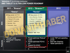 Donanimhaber.com sorgt wieder mit einem AMD-Leak für Aufsehen. In einem Bericht werden technische Details zu der kommenden Tablet-Plattform mit Codenamen „Brazos-T“ verraten. Der Nachfolger der aktuellen „Brazos“-Plattform-APU „Desna“ heißt bei Brazos-T dann 2012 „Hondo“.
