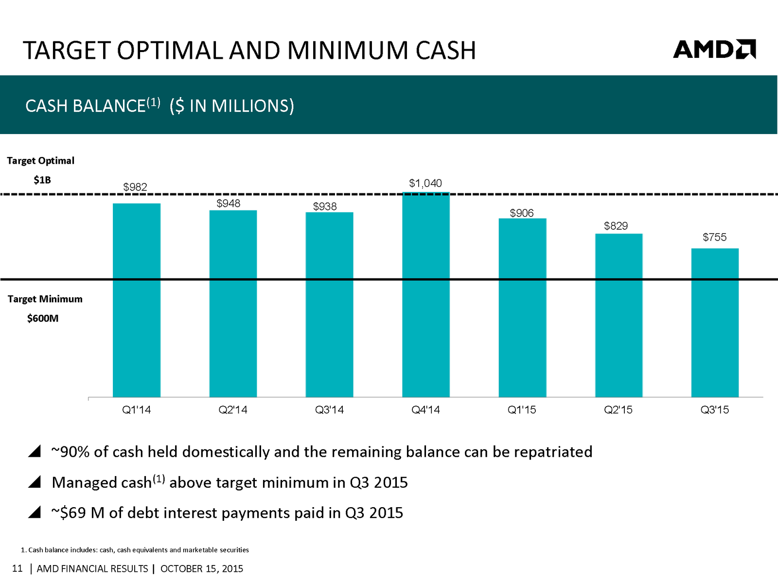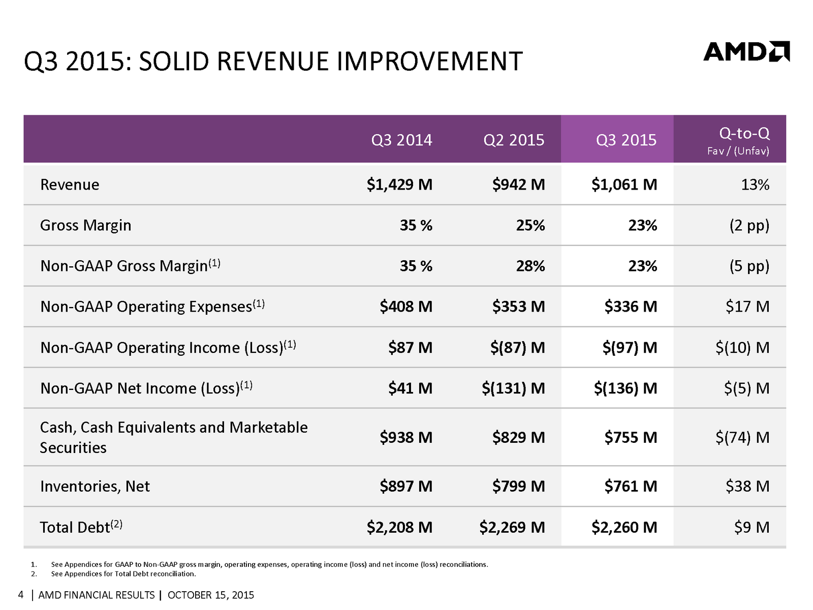 Nach Geschäftsfeldern sank der Umsatz mit PC- und Grafikchips von 781 Millionen US-Dollar in Q3/2014 auf 424 Mio. im 3. Quartal 2015. Nach einem operativen Verlust von 17 Mio. im vergangenen Jahr stürzte dieses Geschäftssegment auf einen Verlust von 181 Mio. Dollar ab. Behaupten konnten sich die Bereiche Enterprise, Embedded und Semi-Custom mit 637 Mio. Nettoumsatz und einem operativen Gewinn von 84 Mio.